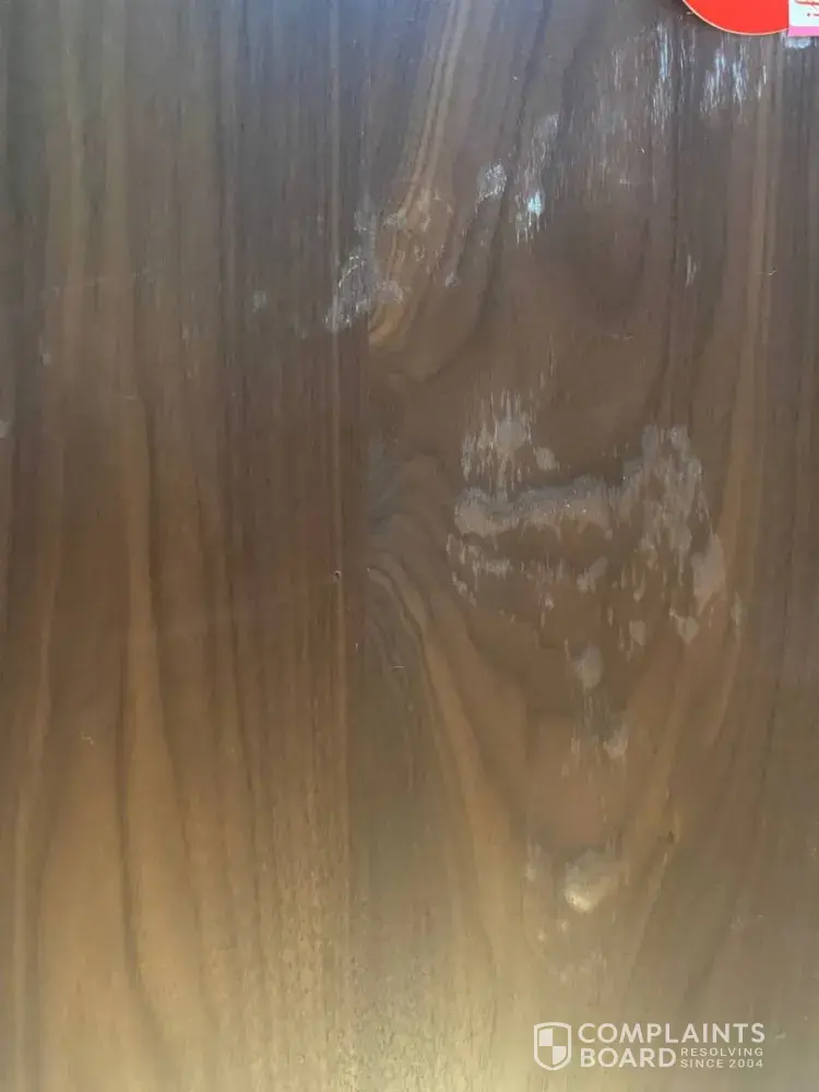 Around 12 months later, during our dinner, a few drops of water fell, which after 20 minutes we cleaned completely. What wasn't our surprise when the biggest drop was, it got impolite, and when drying the laminate stuck to the cloth. Luckily for me, this happened days after the warranty expired.