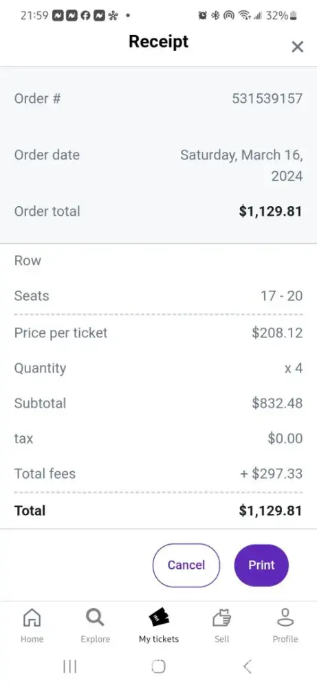 I bought a ticket to the Florida Panthers game for 5/11/25. I never received the ticket and explained the circumstances of an out of town needing the ticket at least 2 days prior to the game. All I received was excuses and nasty un-professional customer service taking no accountability. This ticket issue cost me $100's of dollars in logistical nightmares. Also, I was charged almost $300 per service fees on 3 tickets. 2 arrived the third most needed ticket for the same event still never arrived. It's 4 hours prior to game time and I purchased it last week. Dealing with their customer service and customer service managers was a nightmare. I will never use them again!