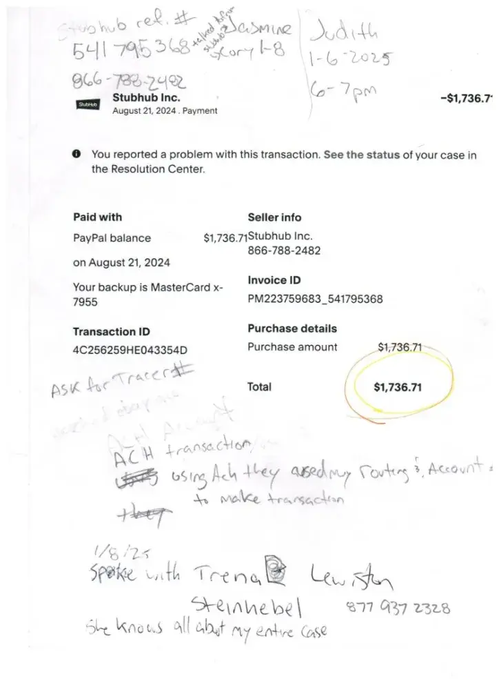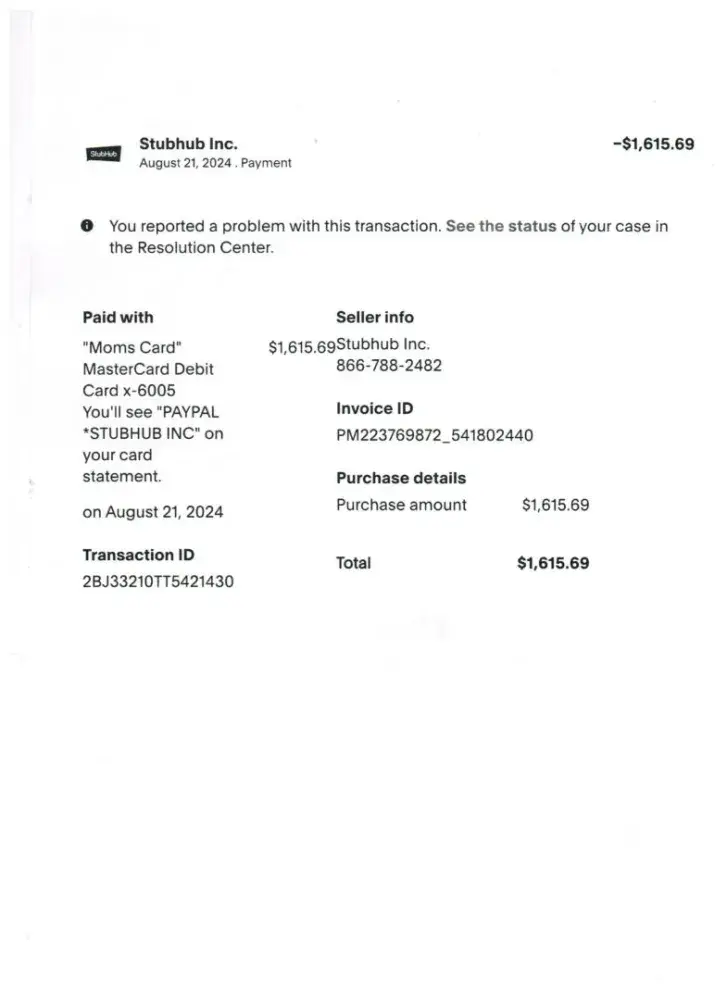 good day and thank you for your time. this is a complaint against StubHub for false classification of one transaction among many others not being classified as Fraudulent although the other transactions at the same day and time have been. August 21, 2024 my, John Jeremy Scott, PayPal account password was hacked and an outside individual made 5 purchases for StubHub tickets. $1,736.71 transaction ID 4C256259HE043354D, $1,615.69 transaction ID 2BJ33210TT5421430, $2,533.31 transaction ID 8LJ54978F4264831R, $1,627.68 transaction ID 808836045Y556981M, and $3,010.08 transaction ID 8KR12844U1637251J, all placed on the same day, all at the same time. now the facts are simple, I suffered a closed head injury in 1994, I live on a disability check now, my monthly income sets me annually below Michigan's poverty line. my truck has 400,000 miles on it and would probably break down still inside the state lines, and all but 1 purchase has already been deemed as being Fraudulent and refunded back to the paying source of PayPal. I have asked continuously to have the amount of $1,736.71 be classified as Fraudulent and submitted to PayPal even though each time I get off the phone with someone they believe my Fraud claim and say they will list it as such, yet crooked company continues to inform PayPal that I made the transaction. well of course it looks like me, what do you think happens when someone hacks a PayPal account holder's password and gains access inside the account? I was not home at the time and found out much later, and stopped all but one transaction, however the amount of $1,736.71 I could not stop and since it went through, PayPal is trying to take the blame away from them by making me pay for their mistake, however if StubHub would actually for once in their career and do the right thing by telling PayPal that this was an UNAUTHORIZED Transaction and relay this to PayPal as being Fraudulent, my problems with PayPal would go away. Unfortunately StubHub from what I have been reading is not a respectable company. 5 purchases were made from my account, all on the same day and time, and 4 already refunded and deemed Fraudulent yet this one somehow I must have placed while living month to month, no savings, and no chances of ever getting to wherever this event was taking place. I would be happy to happy to classify this complaint as being resolved, along with removing all bad reviews I left on Facebook on every single message line, over and over and... please StubHub do the right thing and inform PayPal that the amount of $1,736.71 is fraudulent and unauthorized. I have made out a Police Report along with all documentation I have kept in a folder to prove my innocence in this complaint.