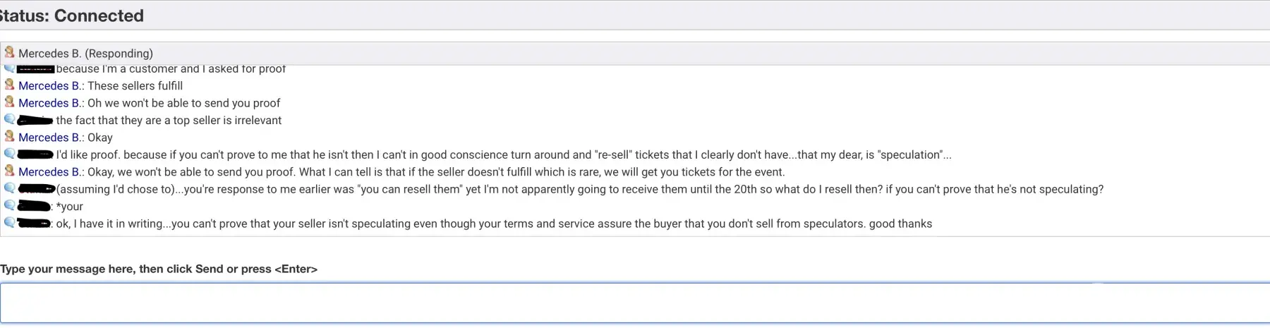 I decided to try another agent via messaging on their website so at the very least I could have a record of the conversation. they gave me the same canned response: We won't refund, the seller will send you tickets the night before the concert, you can resell them if you don't like this arrangement. (I have screen shots. of the whole interaction).