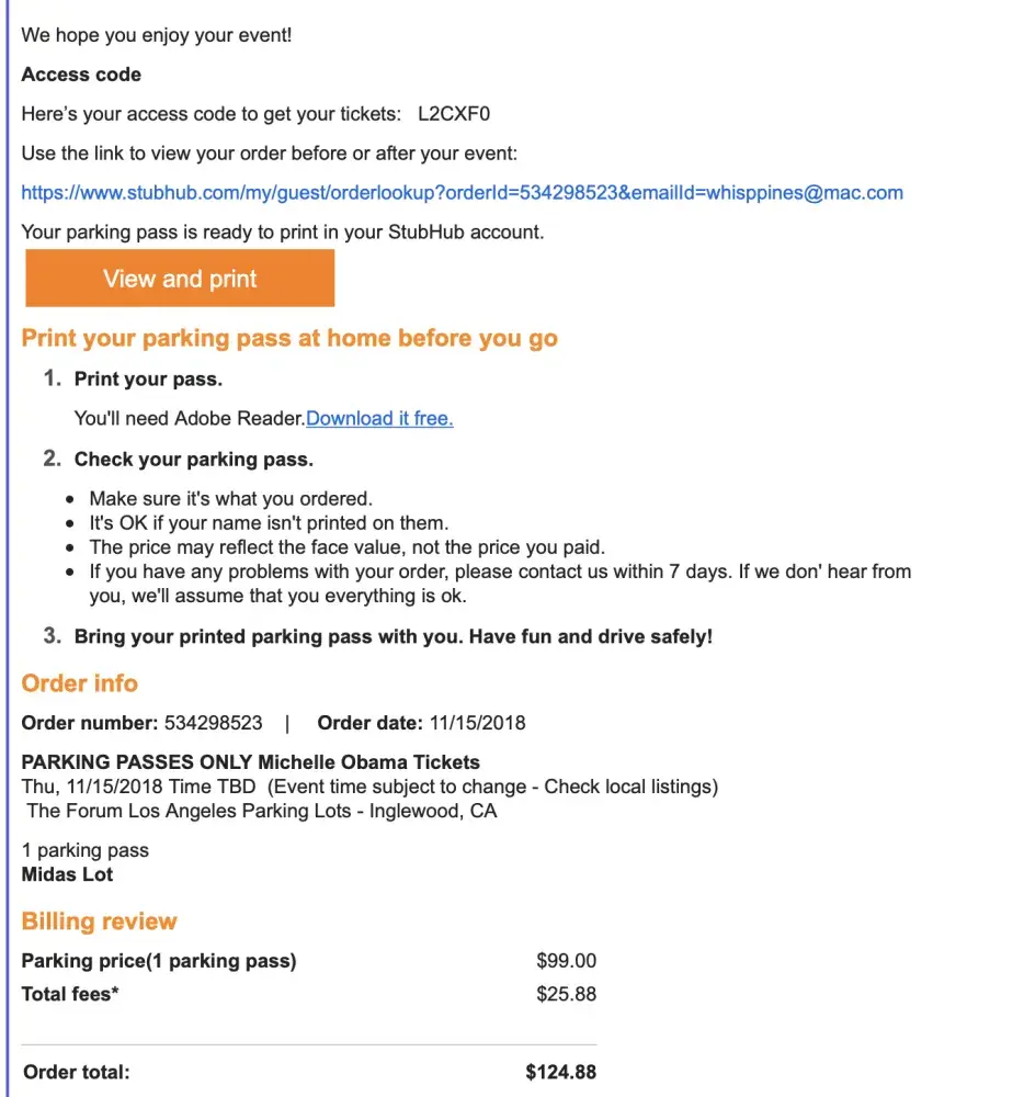 I purchased a Stub Hub parking pass on November 15, 2018 en route to the Forum to hear Michelle Obama speak. I was with a carful of friends and they asked me to get a special parking pass for the event. They cost 124.88, but since I was treated to the event, I felt it was my responsibility to purchase the parking pass. With no time to spare, we stopped at a Fed Ex store to print the tickets. I couldn't get past the "find your order" step because it wouldn't accept the access code I received. The Fed Ex people also couldn't figure out why it wouldn't work. I didn't have time to call Stub Hub and engage their help. Turns out that the last digit in the passcode looked like the letter O, but was a zero. I failed. Never got the ticket. We paid cash for parking and we were late. Stub Hub will not refund my money and simply say, "I'm sorry you had this issue. We won't be able to process a refund for you." I've used Stub Hub in the past and been satisfied. I am very frustrated and disappointed this time.