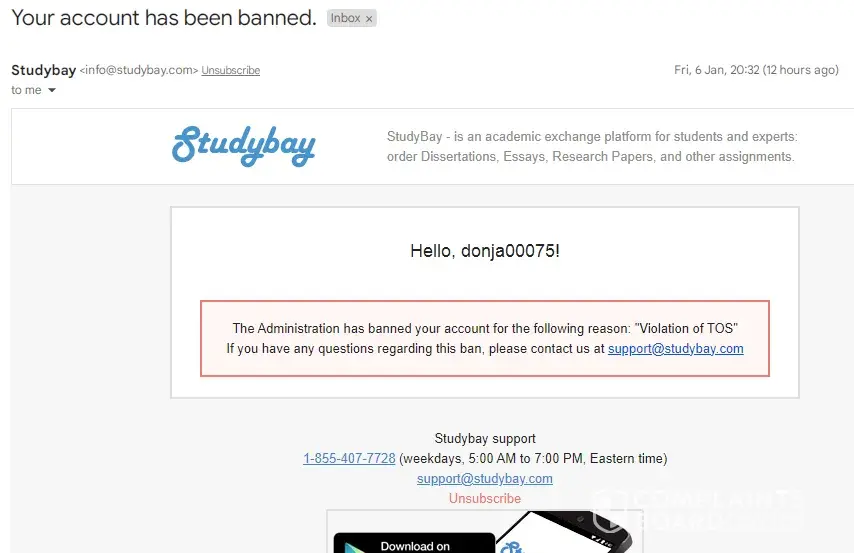 The worst mistake I did is deposit funds for future use not knowing the site is a scam. The support is not responsive yet I have a project in progress that I have paid for and $130 unutilized funds. I am not able to access the site and I am a new customer. None of my calls is received nor text. Everyone should avoid studybay completely. I received an email saying that I have been banned from the site because of TOS. I am a new customer and the project I created has not been completed. I deposited $150 and only used $20 and now they take everything because of "TOS" which I dont even know. The support don't even inform you about anything nor send a message. This is the worst company ever.