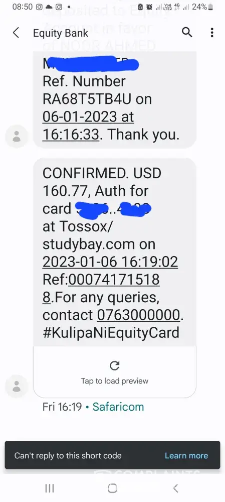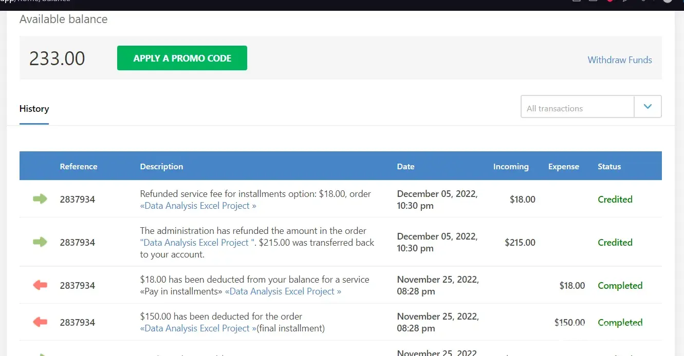 On 12/3/2023 I paid for an essay service. I have used the same person in the pass for previous projects with good results. However this time I was not satisfied and I discussed my dissatisfaction with her. She and I agreed on a mutual refund. I was refunded immediately BUT the funds with to my credit account with Studybay. I have no intention on using their services again therefore I followed the instructions to withdrawal my funds from that account and be transferred back to my credit card used. That was initiated on 12/12/2023 I did receive a confirmation email that those funds should be credited back to my card with 7 business days. It is now 1/7/2024 and I have not received the funds. I have sent emails daily to Studybay with only excuses and was even told the funds were processed on 12/13/2024. I have tried calling for 3 days only to be on hold and then disconnected. I have been in contact with my bank and according to them no pending transactions from Studybay.
