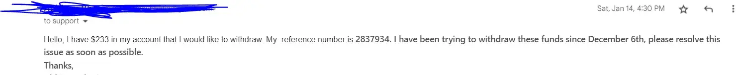 Desired outcome: please refund my $233, i have been waiting since dec 6