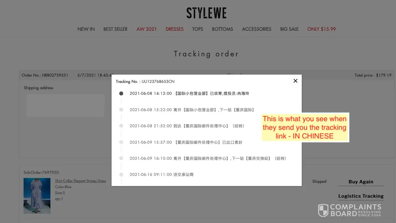 Stylewe.com is a complete scam. I placed an order on May 7, 2021. After six emails and 3 months later, there is no merchandise, no refund, no number to call, and no longer any replies from STYLEWE. Dont seem to be able to upload images to this review, but i have all the completely useless standard email replies from STYLEWE: " your order has been shipped, here is the tracking number. The link info IN CHINESE.