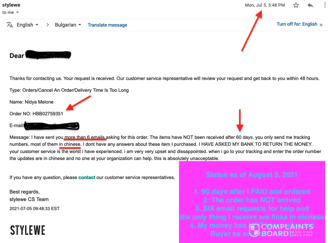 There are many items I’ve purchased from this company, have returned 2 other items for poor quality with no problems so I’m quite disappointed on their handling of this issue. I’m going to think twice and twice more before ordering from Stylewe in the future.