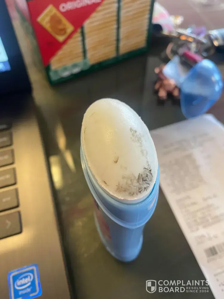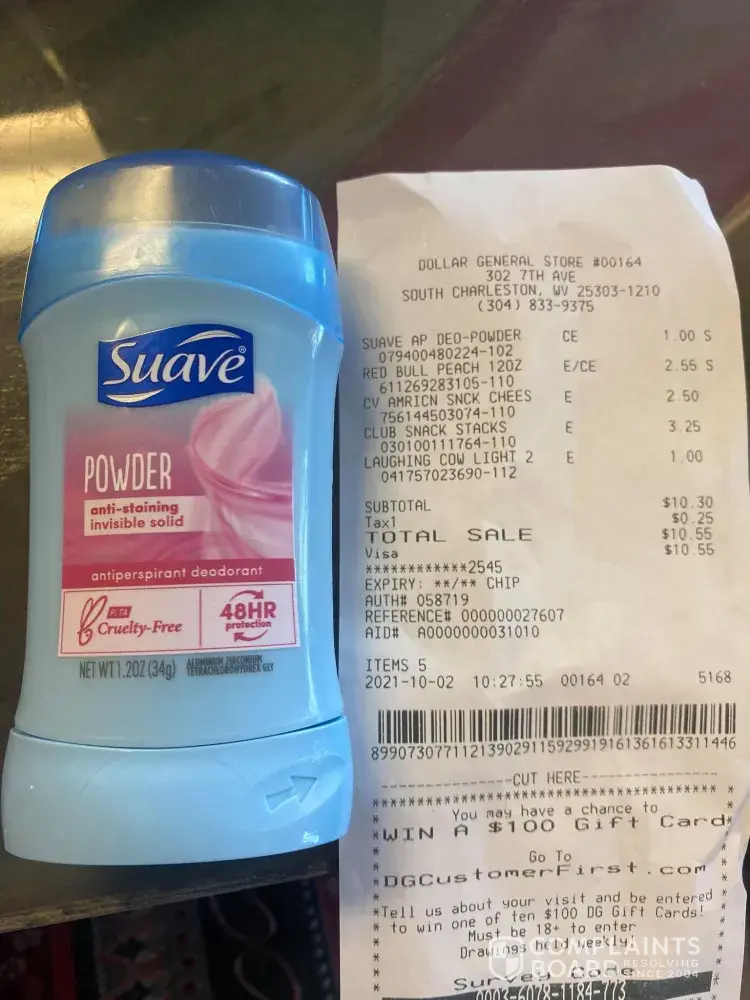 Today I went to Dollar General at 302 7th Ave. South Charleston, WV 25303. (Dollar general store #00164) I made a purchase of some snacks for work, as well as a new tube of Suave Powder Deodorant 1.2oz. When I got to work (literally 30 feet from the dollar general) I opened the deodorant to use. When I opened it, I saw mold all on the inside. This is very concerning considering I use this product on my body. I always use this deodorant, but after today, I think I'll pay the extra money and switch back to using Secret or Dove.