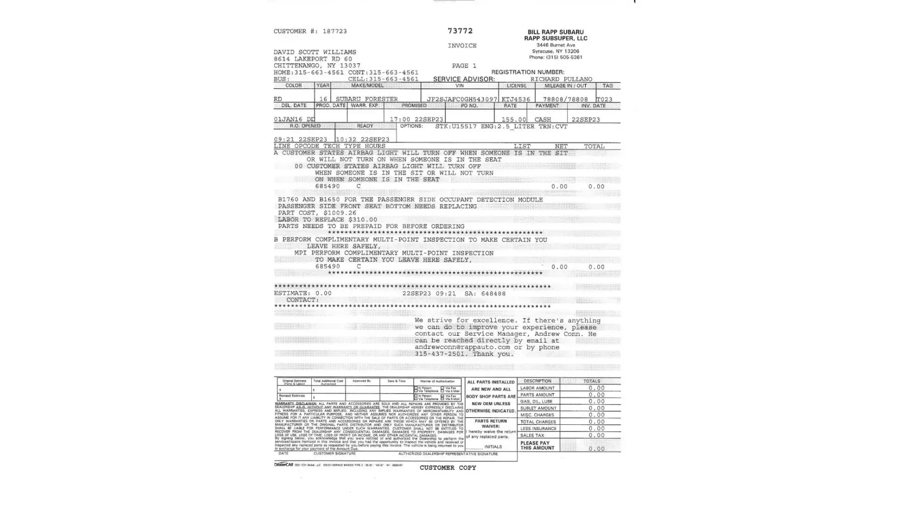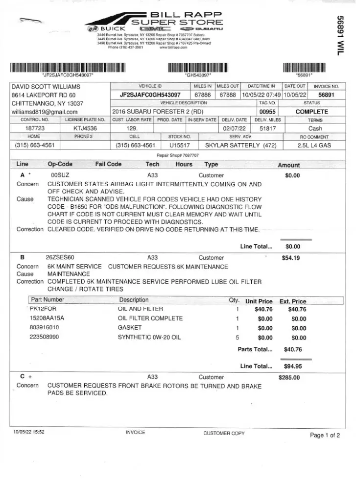 In the meantime Wayne Subaru did an oil change (from January to May 2023 I put 3,000 miles on the vehicle) so it did not need an oil change and they rotated the tires at a cost of $150.