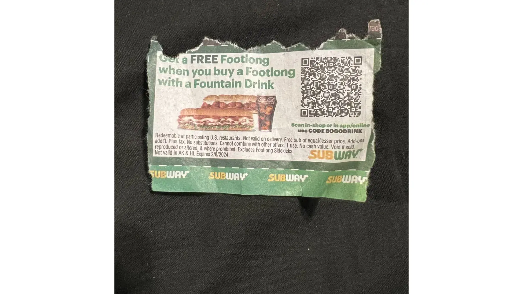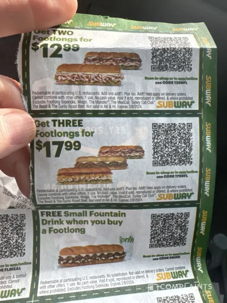 I had a coupon for 17.99 for 3 footlongs. They refused to take my coupon. No where on or in the store did it say they wouldn’t take it. Then when I went to pay they charged me full price and refused to accept it. That’s falls advertisement. If they are going to do that they should post it. They even had the scanner to scan it and still refused. Date is 2/10/24 transaction #1A-341630