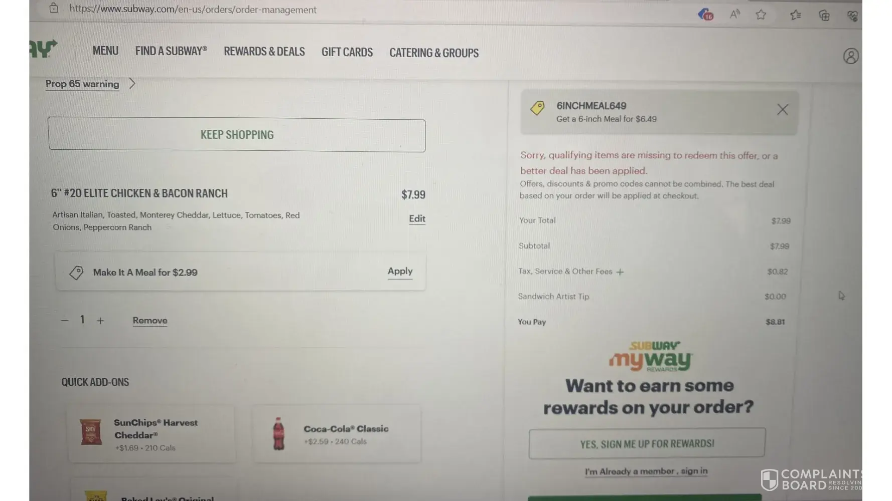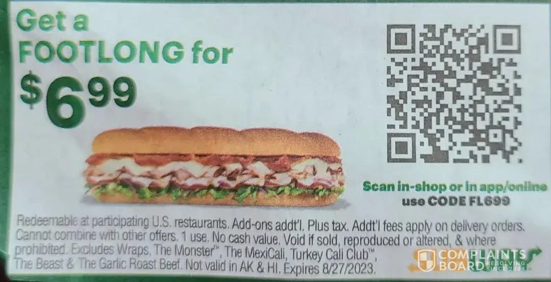 Read full complaintPampa tx subway not accepting it's coupons 07/14/2023