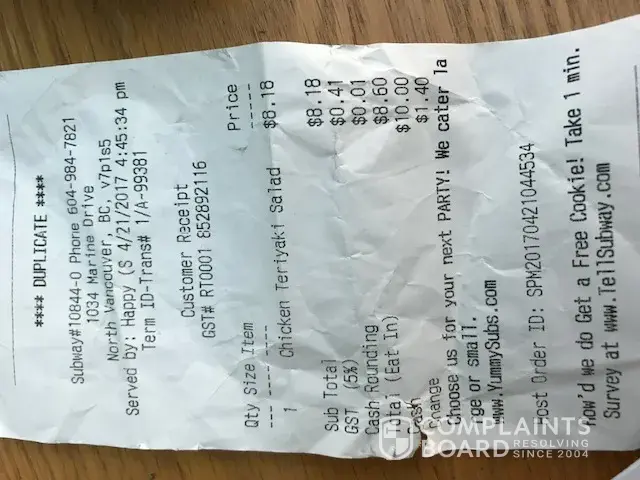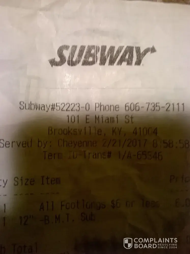 Store 1118 Columbus St. Ottawa IL. Order Number SPM20170426125036. Saw ad for the $5.00 ft long spicy sub. I had to ask about it because it wasn't on the menu. No where did it say what was on it. It looked good. When I saw them making it I asked for a couple of slices of Hot Capicola. No where did it say on the menu that 3 slices of meat would be and extra $3.00 and the girl never said a word. ( I can get a lb at the store for that price) The veggies I asked for were so stingy that I cut the sandwich in half and put them all on one side. So my husband and I each got a 3" sub for lunch. This is the 2nd time we've been to this Subway. The Other one on North Columbus is slightly better. I was never a fan of Subway the bread is always dry and stale tasting. Never will go there again. Over priced and stingy.
