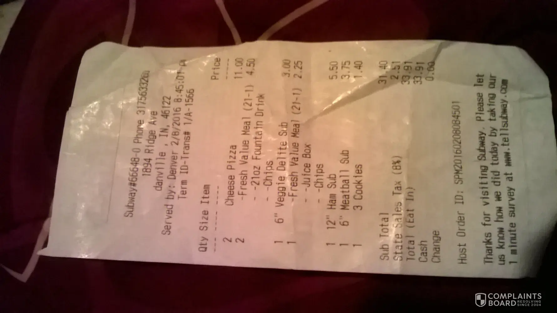 Walmart subway Danville Indiana #66648-0 1894 Ridge Ave Served by Denver 2/8/16 8:45pm Term ID-Trans# 1/A-1566 Ok my order total was $33.91 I used my American express jackson Hewitt card She was ringing it up on the register but swiped my card on a iPad type thing than cashed me out by cash instead of credit well the total on my card differs from my...