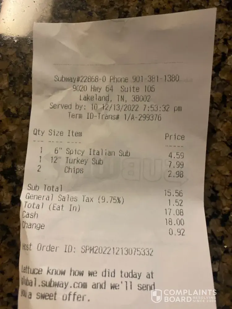 My daughter and I went to Subway in Lakeland, TN on 12-13-22. Store #22868-0. We ordered a 6' Spicy Italian and a footlong Turkey & Cheese & 2 bags of chips.