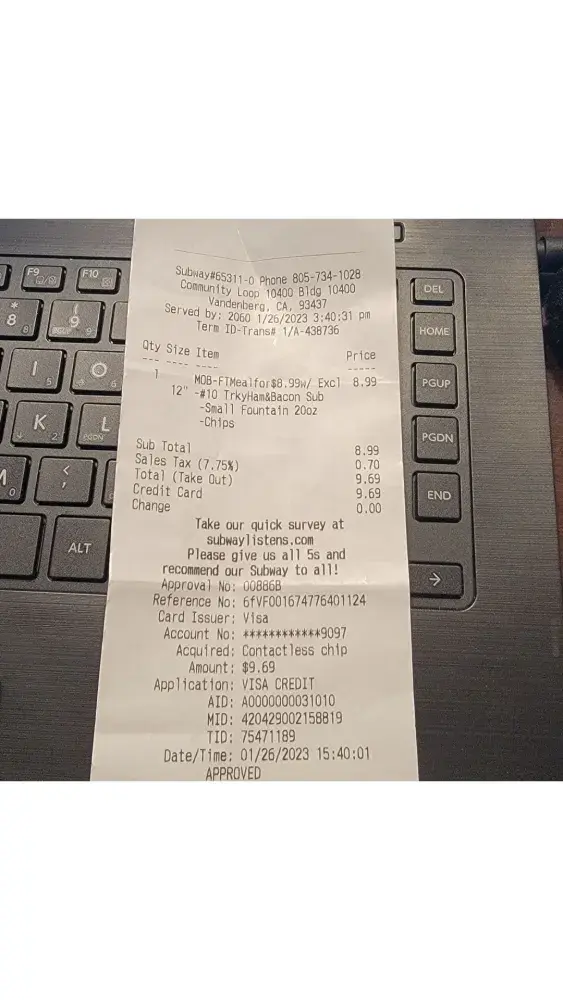 I visited the subway location at Vandenberg SFB today, I ordered a footlong all American club sandwich Turkey, ham, and bacon, I ask the food service worker to just give me ham instead of turkey. She rudely replied that that will mess up her inventory, but I could pay for extra ham. She was very rude and unwelcoming. At the register I presented a footlong meal coupon, she informed me that she doesn't have medium cups and I would have to pay extra for a large cup. I told her it's not my fault she doesn't have medium cups. She again said it would mess up her inventory if she gives me a large cup. So, she gave me a small white cup without a lid, because she is also out of lids. For my inconvenience she should have given me a large cup with a lid at no extra charge. I wasn't able to go home and enjoy my sandwich, because the cup had no lid, and I don't want to waste it in my car. This is not the first time this food service worker is always rude and act if she is running a bootcamp. I will not purchase anything at Subways at that location as long as she works there.