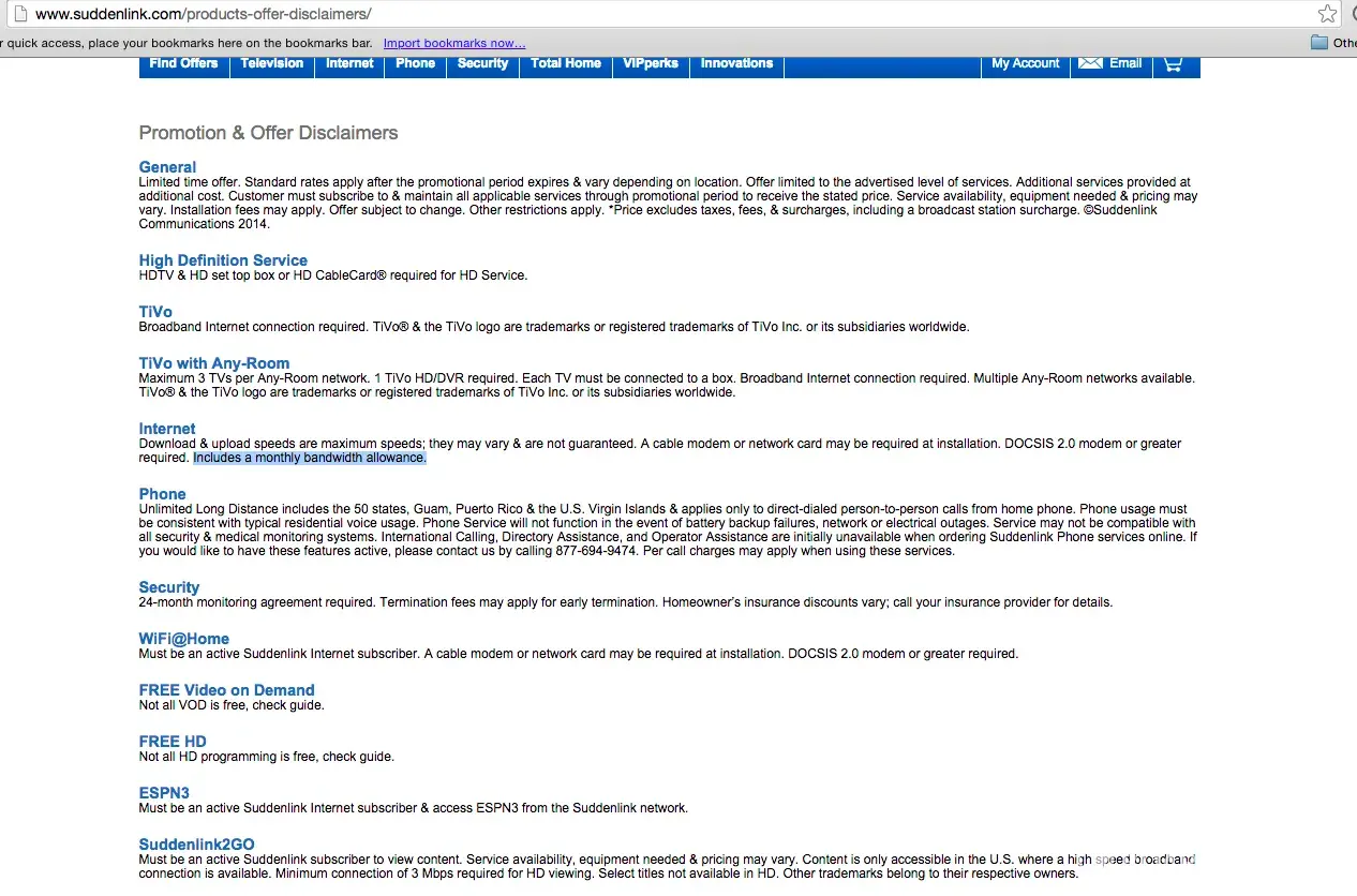 At the end of 2014, Suddenlink heavily promoted new "FREE" speed upgrades for all its customers in this area. All we had to do was go pick up a new modem from the Suddenlink store in the mall. Three months later, while investigating an internet outage with technical support, the support rep matter-of-factly states that I've used up my "data allowances" of 250GB. I was stunned. Although he claimed I was "clearly informed in this change in service policy", I accuse Suddenlink of doing everything possible to hide this from users. In fact, searching their web site you will NOT find any mention of data allocations, nor any link from their home page to any mention of data allowances. On the page where they present available service options, not one mention of data allowances. In fact, they tout their 75Mbps service as being "great for streaming television and movies" but make no mention of the fact that you have a LIMIT to how much you can stream. At the bottom of that page, in small type (11.8999996185303px to be exact) is a link to "Disclaimers". On that disclaimers page, slightly less than halfway down the page in 12px type are the words: "Includes a monthly bandwidth allowance." No description of WHAT those allowances are, how they differ from plan to plan...nothing.