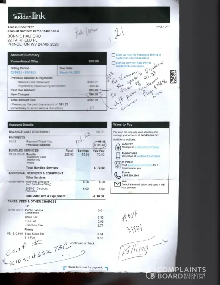 I called suddenlink 3/30/2021 at 7:45am ph# 1/[protected] s/w Jackie. I explained I was moving, also unhappy with latency issues and wanted to cancel my services by 4/1/2021. She said she will cancel my services and asked for a forwarding address. I gave her my PO Box for a forwarding address for the final bill. I asked if I could still pay online as I...