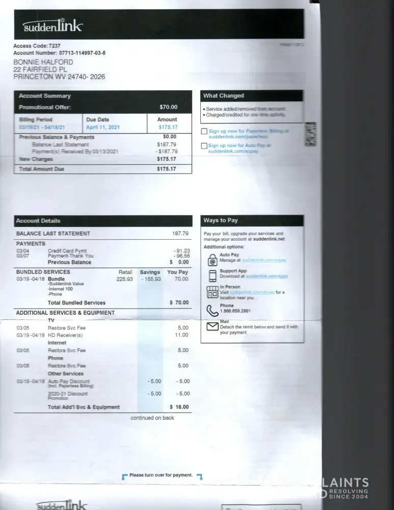My elderly aunt and uncle had Suddenlink installed for cable, phone and internet services. First billing period was 12/19/20-01/18/21. During installation, they received the wrong cable box for the services they had ordered. They had one channel during this month only, although they paid for Suddenlink Value bundle service. A call was placed to Suddenlink to have this problem rectified. As of 01/21/21 their balance was $0.00 per Stephanie at Suddenlink customer service as they had already paid the bill. The technician was to come on Monday 02/05/21 to install the correct box. The technician did not show. This appointment was then rescheduled by me and they were to show up the following Monday and did not show up again. They finally showed up on Thursday with no notice and installed the correct box. Mrs. Halford received a bill for 187.71 with an past due amount of $91.23. This amount had already been disputed by me and was assured that this amount would be taken off of their bill. On 02/23/ 21 I spoke to Andrew and the amount was to be taken off, which left a balance of 96.56. In the meantime the services were shut off for past due payment in the amount of 91.23. When Suddenlink customer service was called I was told that in order for the charges to be disputed they must pay the past due amount which they did on 03/04/21. The bill dated 03/19/21 to 04/18/21 shows an install fee of $25.00 which should not be charged as it was Suddenlink's error. There are $15.00 worth of restore service fees on this bill and should not be charged to them as Andrew stated the $91.23 would be taken care of and if he had done so they would not have had a past due balance. The $91.23 should be credited to their account in addition to the $15.00 reconnect fees. There is a $10.00 credit card processing fee that was charged to their account because they had to use the credit card to get services restarted when they were shut off inappropriately. Taking into account all the unnecessary charges, they should receive a credit of $141.23. I expect that you will make this right for them due to the unnecessary stress and hardship you have caused. This is bordering on elder abuse and will not be tolerated by me as their Power of Attorney. If this is not resolved as soon as possible it will be taken to higher authorities for their review.