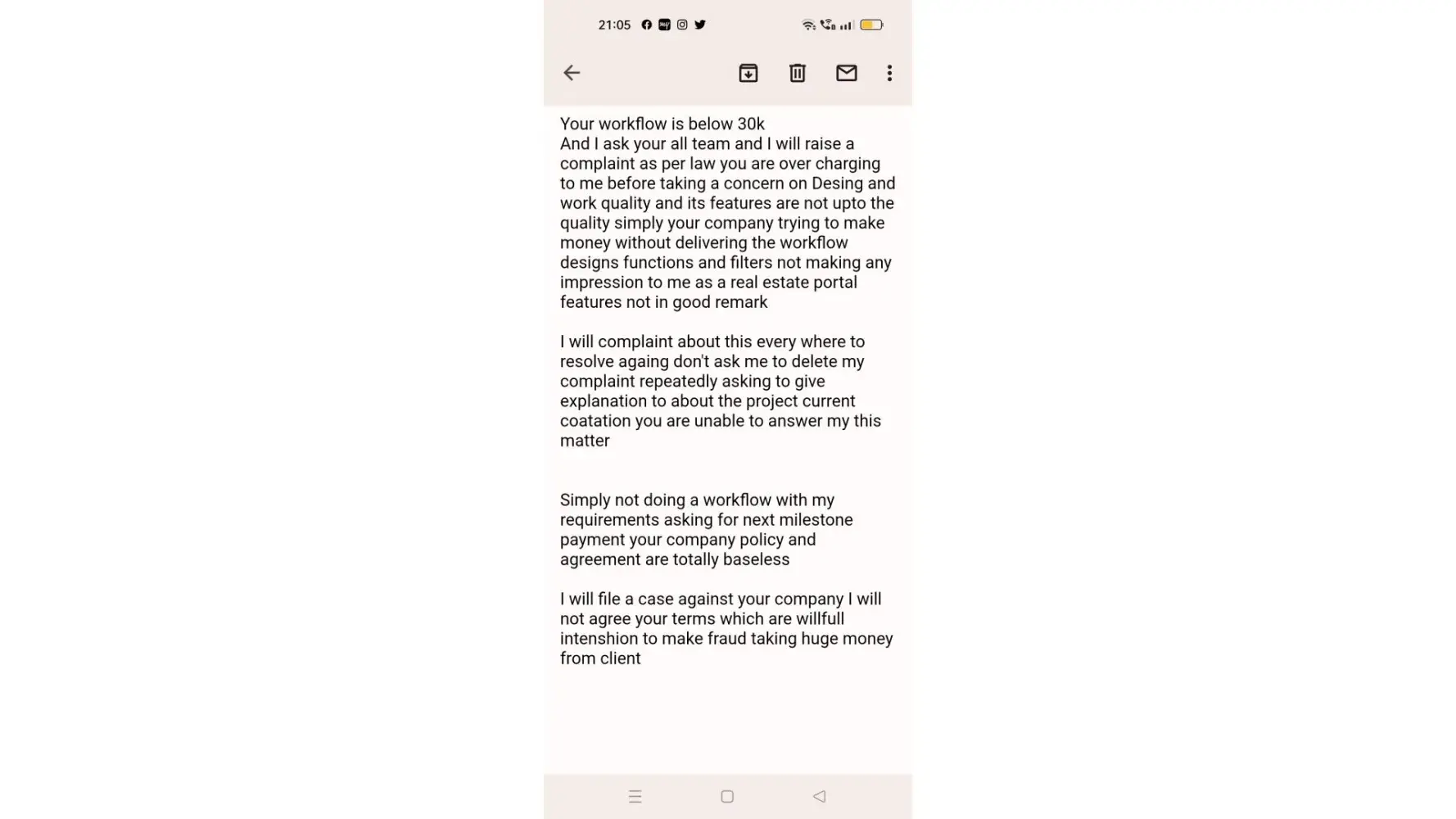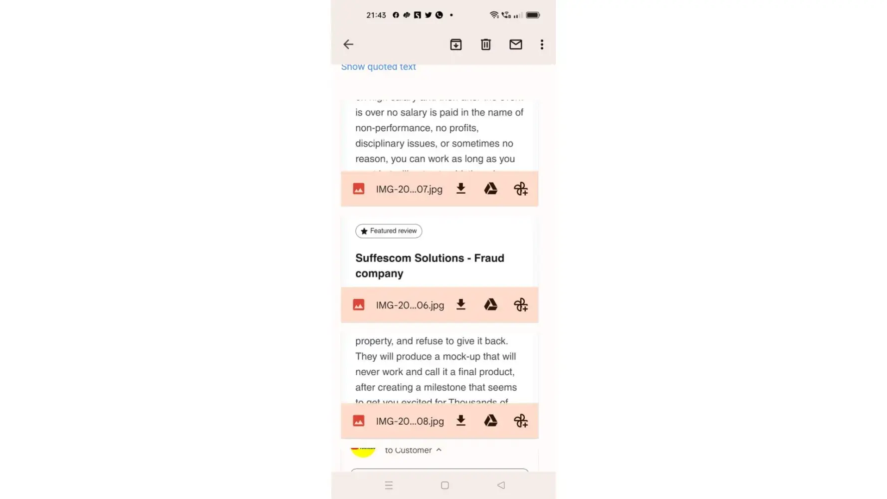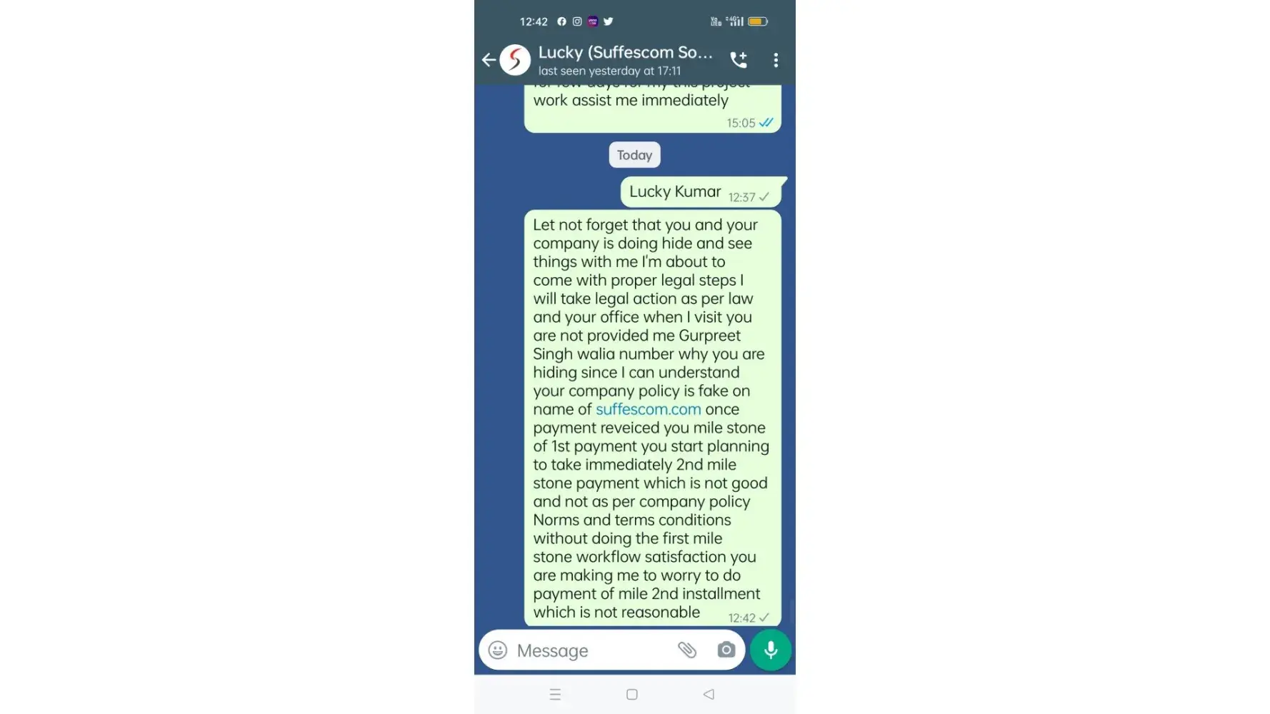 Let not forget that you and your company is doing hide and see things with me i'm about to come with proper legal steps I will take legal action as per law and your office when I visit you are not provided me gurpreet singh walia number why you are hiding since I can understand your company policy is fake on name of suffescom.com once payment received you mile stone of 1st payment you start planning to take immediately 2nd mile stone payment which is not good and not as per company policy norms and terms conditions without doing the first mile stone workflow satisfaction you are making me to worry to do payment of mile 2nd instalment which is not reasonable