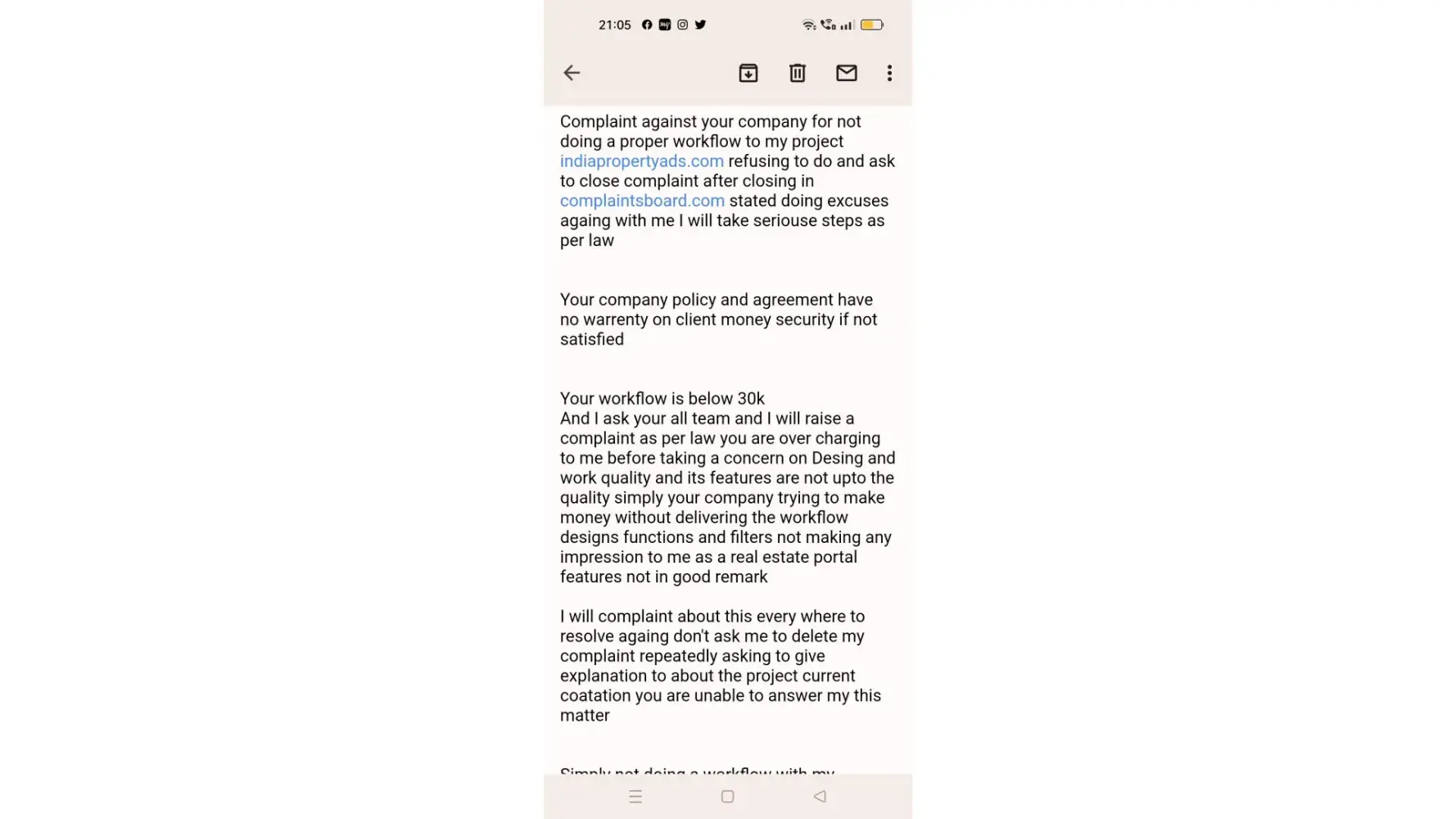 Complaint against your company for not doing a proper workflow to my project indiapropertyads.com refusing to do and ask to close complaint after closing in complaintsboard.com stated doing excuses againg with me I will take seriouse steps as per law