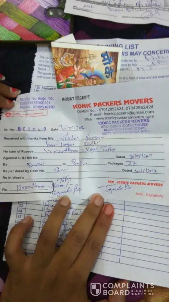 One of our relative has searched through your website (sulekha) and booked household items in sharing with Iconic Packers and Movers to transfer from new delhi to Patna. They have not asked for delivery address and when we ask to write down the delivery address, told will take from phone at the time of delivery. Taken advance of Rs.10000/- and not mentioned it in money receipt given to us and told at the time of final billing will adjust it. On 30th he has booked and till the household items kept in his warehouse and asking us to pay the octroi and insurance charges then only he will send household items. He is not receiving calls also and we are very afraid that we have booked and given our household items in the wrong hand but we have faith on you. please ask him to send our household items at the earliest.