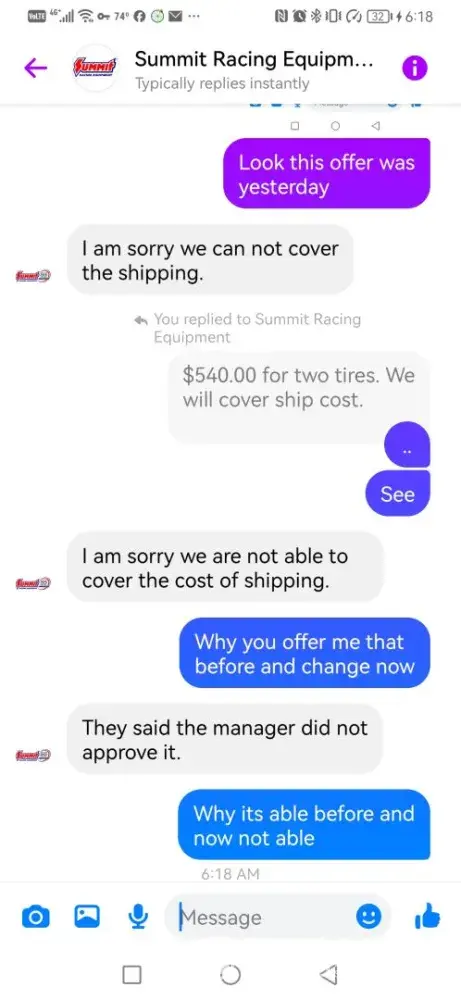 In 17/01/2023.. I order 4 nitto nt01 tire Base on advice from summit racing payed 1247$ .. On the basis that this tire not specifically for drag but after drag thim 3 time Turns out them its for Street not drag use .. After I ask summit to make compensation and they offer me and they Admit of that mistake.. They offer me 60$ discount and cover the shipping Coast.. Yesterday they change mind and cancel the offer And reduce the offer to cancel the cover of shipping and keep 60$ discount