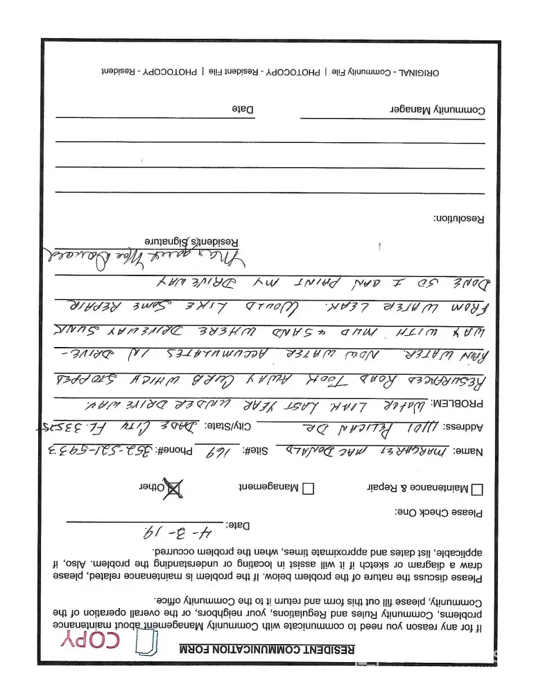 A water leak last year washed out under the driveway and the resurfacing of the road raised the road and the curb at the end of my driveway no longer keeps rain water from washing sand and mud into my driveway where it has sunk. Reported this 3 weeks ago to the office and did not hear anything. Please look into repairing the situation so I can paint my driveway. Enclosed please find the formal complaint.