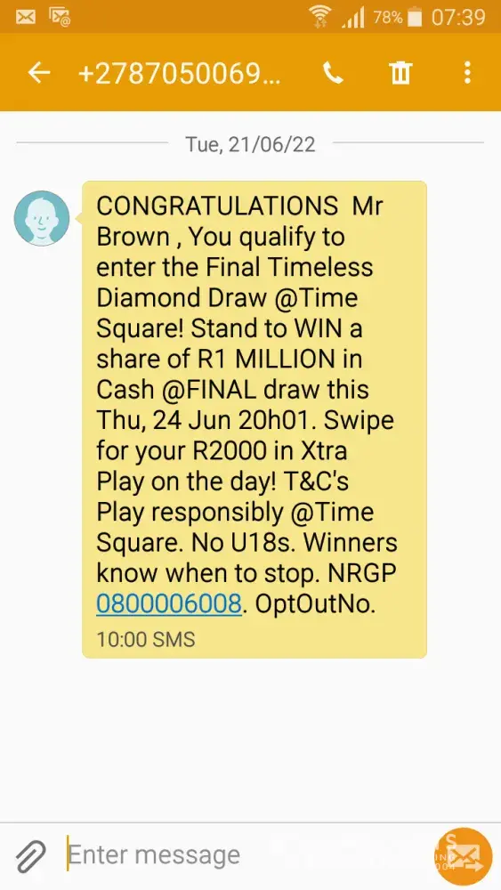 SMS received regarding diamond draw and r2000 extra play