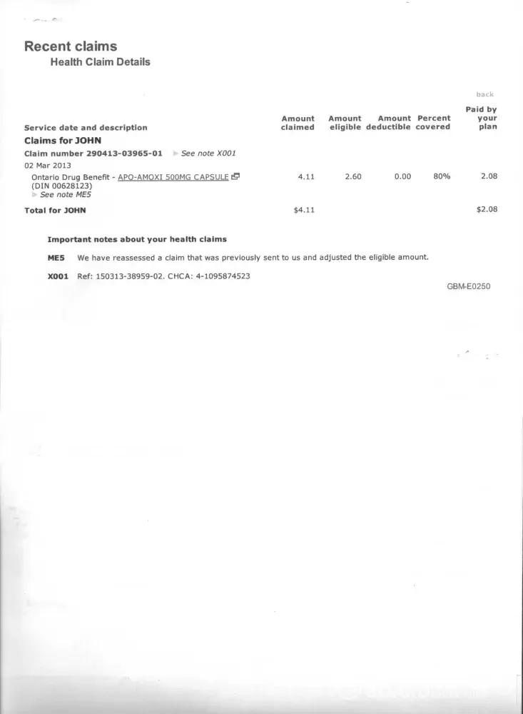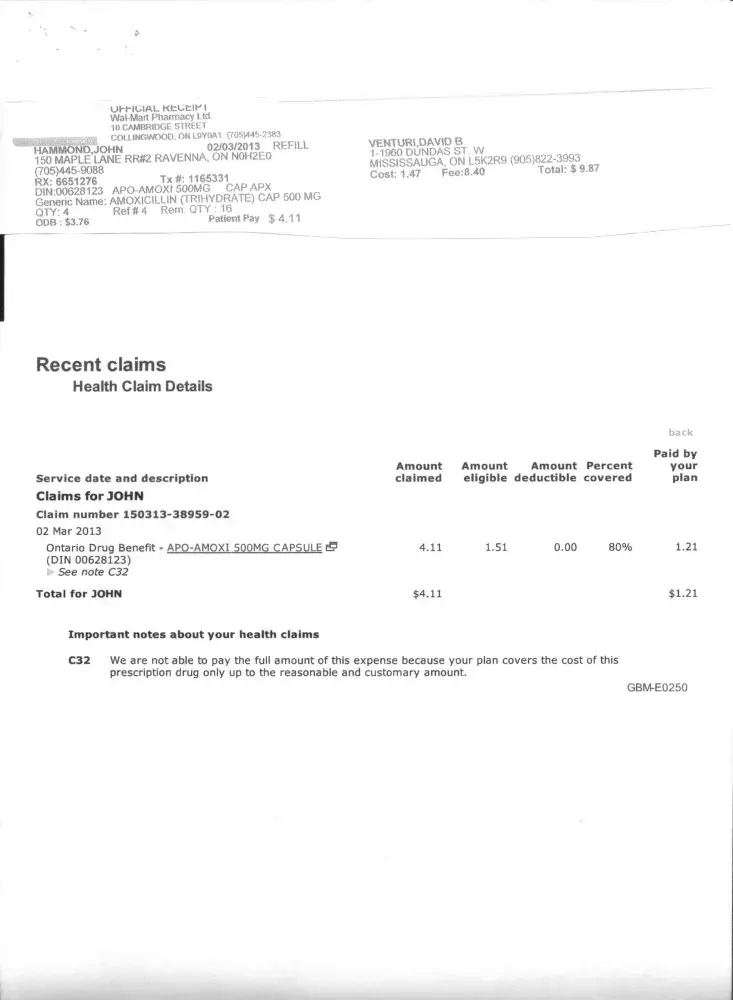 For over a year I have had a recurring problem with claims for low cost prescription drugs. I am covered by the Ontario Drug Benefit plan for seniors so my cost for most prescriptions is $4.11. For some never explained reason when I submit a claim for a lost cost drug the claim is covered "only up to the reasonable and customary amount" (see example attached).