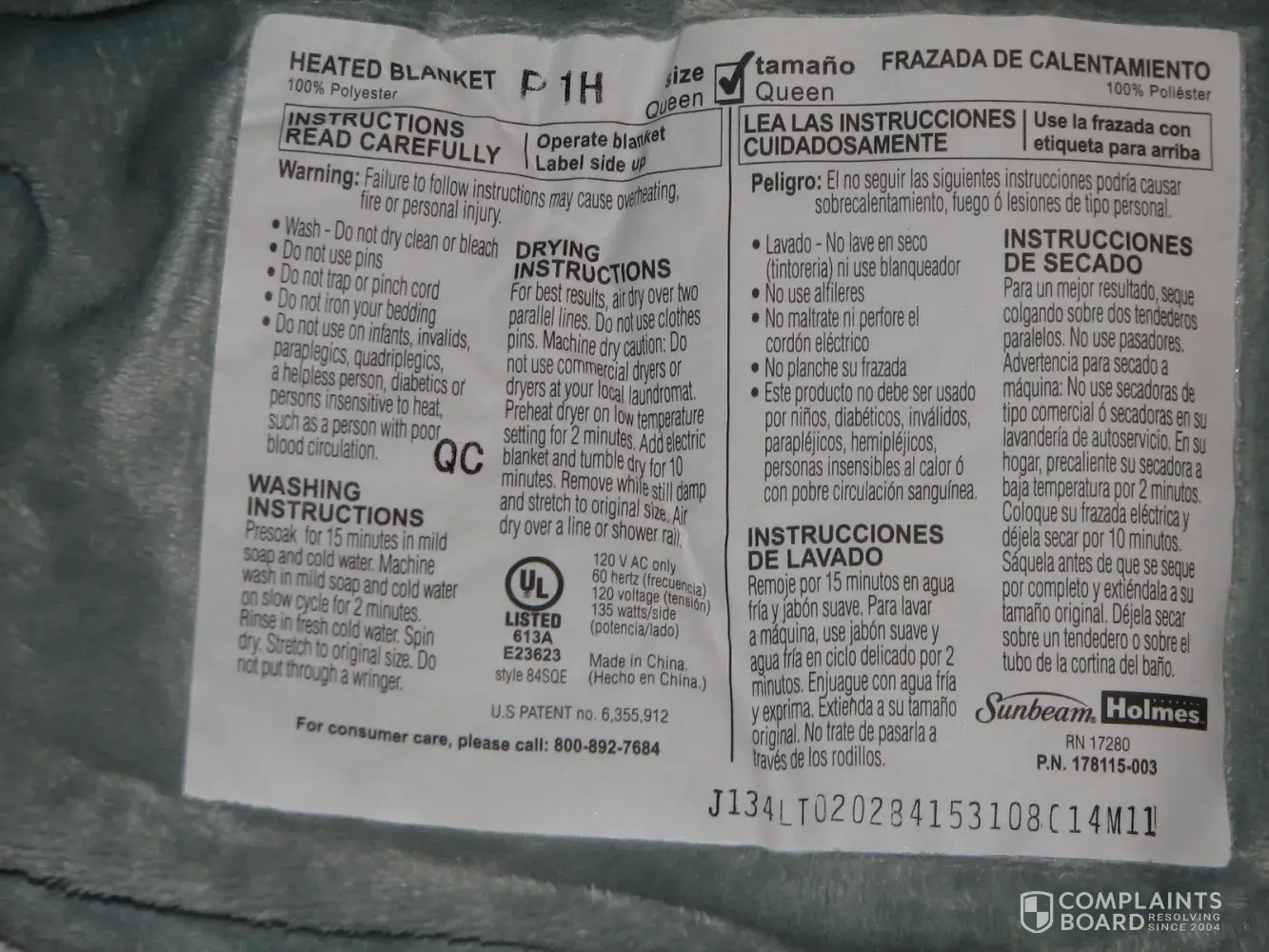 I am complaining about sunbeam blanket
