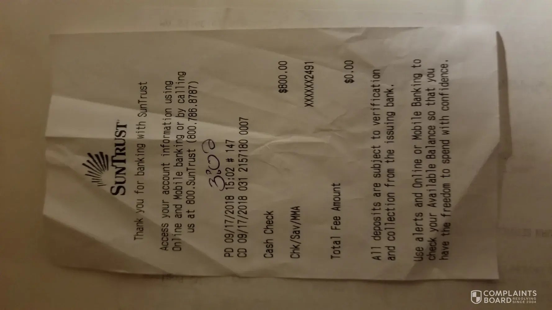 I opened an account with SunTrust in July of 2018 for $500.00 new account promotion. I deposited my pension check in person at a branch location with a teller.