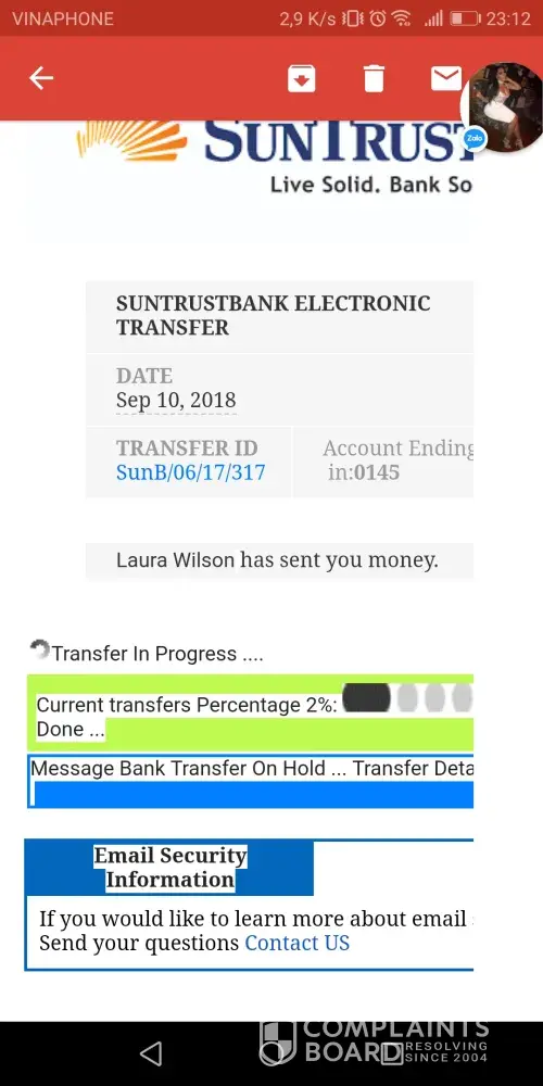 - at 10/09/2018 i received email from suntrust bank by email address : [protected]@suntrustbanktransfer.com