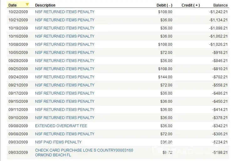 last week my girlfriend and i knowingly overdrafted are account on a friday. we had two dollars and some change in the account. she went to the dollar store, two days before friday and spent one dollar and seven cents, wich left us with about a dollar in the account. then on friday i went to seven eleven and spent eleven dollars; overdrafting the account. so we knew there would be a $36 fee pluss the $10 i spent. well it didnt work out that way they held on to the dollar store transaction until after the seven eleven trans action went through. this overdrafted the account twice wich is $36+$36+$10= -$82, instead of the $46 dollars we thought we would owe them. so, we said ok thats fine they got us again those sneaky ###. we had to wait a week before either one of us got paided again to deposit any money into the account. so, on friday when we got paid her money was directly deposited into the account from her payroll at mid night. we checked the account to make sure they didnt hit us with an extended overdraft fee and they didnt the only money they took out was the $82. so, we went and paid bills and spent the rest of our money on what ever we wanted to spend it on. we left $4.52 in the account. after 5:00 p.m. that evening we checked our account online and sure enough there was that extended overdraft fee of $36 wich put our account into the negative $31.48 and charging an additional overdraft fee of $36 for going into the negative. now our account is at -$67.48. we called the bank and told had they posted that extended overdraft fee at the beginning of the day we would have left enough money in the account to cover it. they said that there was nothing they could do about it, that our ounce a year courtesy overdraft removal had already been used in january. in january they gave us an overdrat fee for nothing then we had to call and argue with them to get it removed and they called it a courtesy! you are supposed to have seven days to deposit money into your account to avoid getting an extended overdraft fee, but its really six days. because when we overdrafted the account last friday they counted friday as a day. it should have been fri to sat 1 day, sat to sun 2 days, sun to mon 3 days, mon to tues 4 days, tues to weds 5 days, weds to thurs 6 days, and finally thurs to fri 7 days. banks are full of heartless money grubbing [censored]bags. i hope they all die broke and overdrafted.