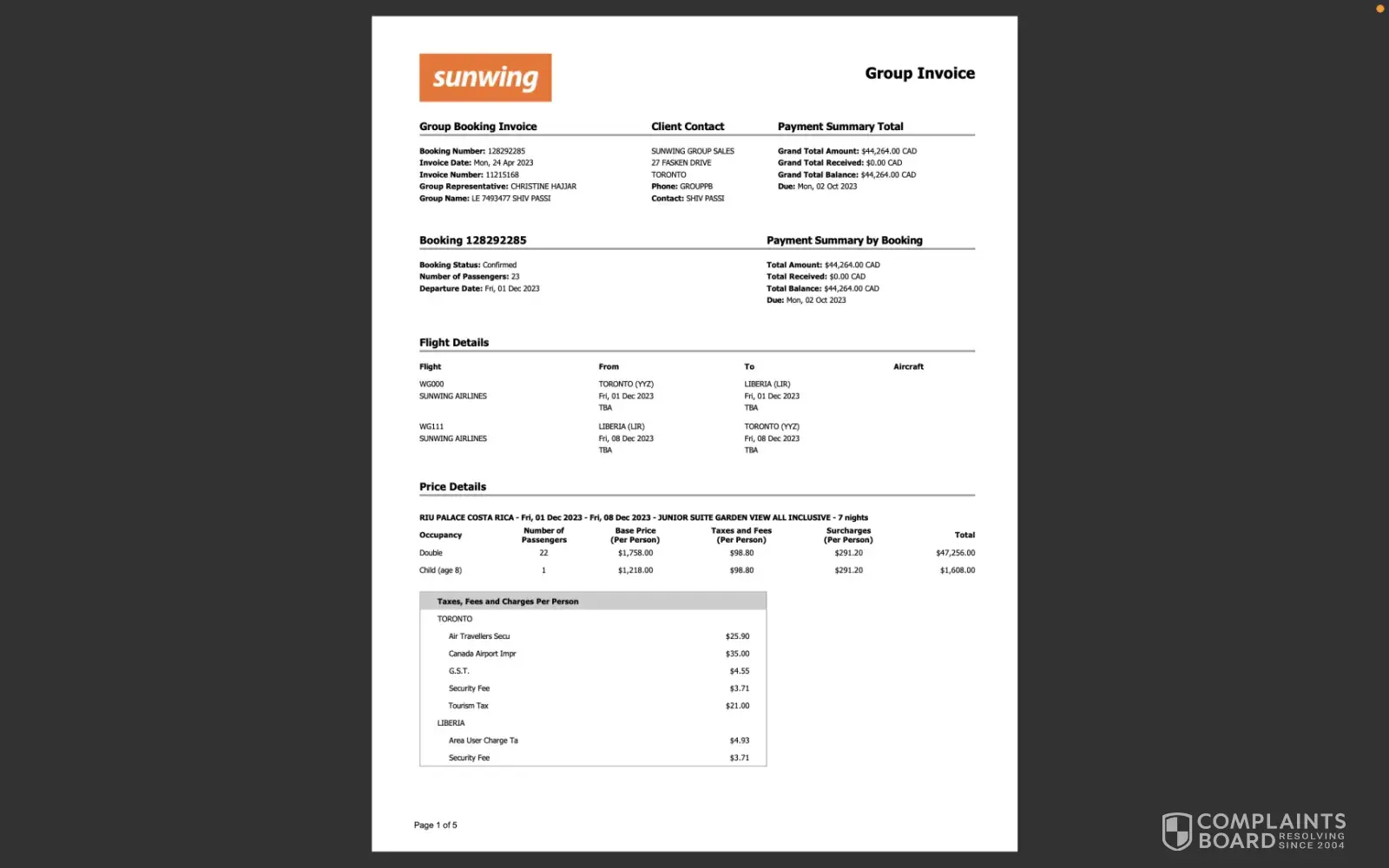 480 Sunwing Travel Group Complaints