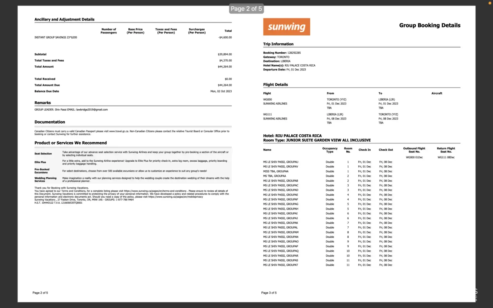 We were supposed to be traveling on December 1st to the 8th from Toronto to Costa Rica on a family trip which included 22 of us including my brother that passed away recently. Unfortunately, my brother was admitted to ICU last week and he passed way unexpectedly. We had emailed Christina Hajja our agent if last week while my brother as in ICU if she could assist us in anyway but due to the fact that we had not purchased insurance she stated that Sunwing will not be refunded any of the $44,000 or change the dates.. I called several times asking if they could just simply move the booking to another during Sunwing's offseason and we would be happy to pay an additional charge but none of your representatives seemed to care or show any empathy for the unfortunate turn of events for my grieving family with the holiday season being around. I understand we did not purchase the insurance but most travel companies would extend the courtesy to at least let us push back the trip due to the untimely death of a loved one.