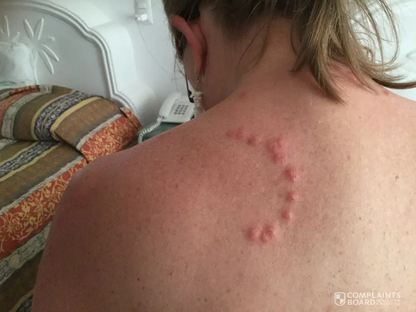 I went back to the hotel after picking up my laundry and asked them to pay for the drugs and the laundry and they said they could not but they would refer it to management. They then said I probably got the bites on an excursion to which I replied that we had only arrived Friday and hadn’t been anywhere yet! I asked to speak to the manager and was told to come back at 1 p.m. and I could talk to her then. So we went for lunch and returned for 1 p.m. and were told that the manager had not yet arrived and we should come back at 3 p.m. We returned at 3 p.m. on day three (Sunday) of our vacation unable to go anywhere, in dire pain from the bites which were now swelling up (I have included pictures for you) and were told that she was not in and they could not say when she would be. Then we were told to check back at 9 a.m. on Monday. We checked back on Monday and were told that she would be in around 2 p.m. and we should come back then. By then I was very ill form the bites and feeling light headed. I was crazy itchy and had developed large blisters over all the bites. I took a cab to the hospital where the emergency Doctor advised that he was pretty sure of what it was but could not put it in writing as the hotel could take action against him. Then he prescribed a medication that he said would stop the bedbugs from biting and an antibiotic to manage the infections and also recommended another topical to treat the itching and burning from the bites.
