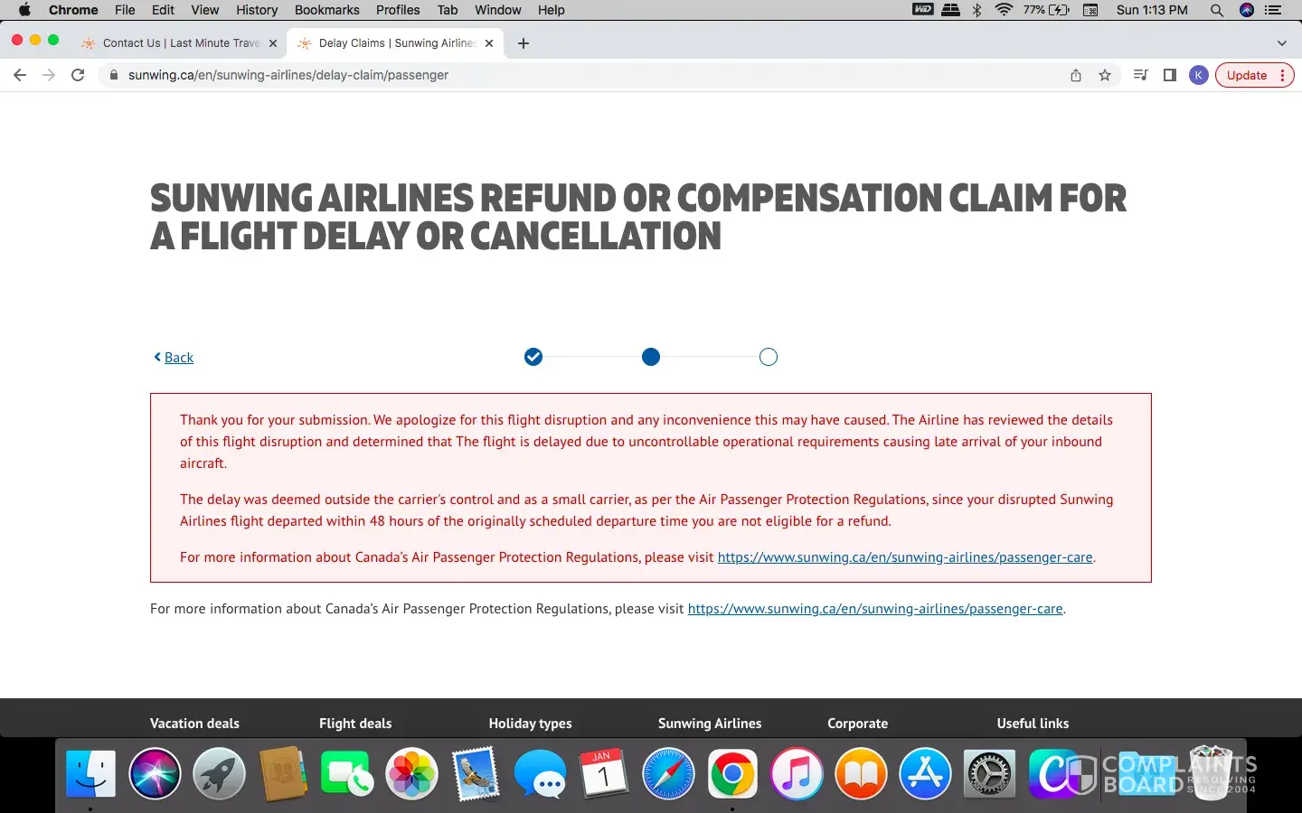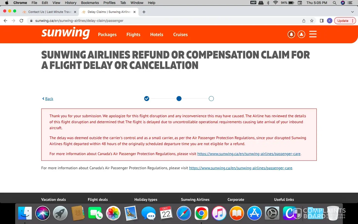 Sunwing is declining claim for flight delay .