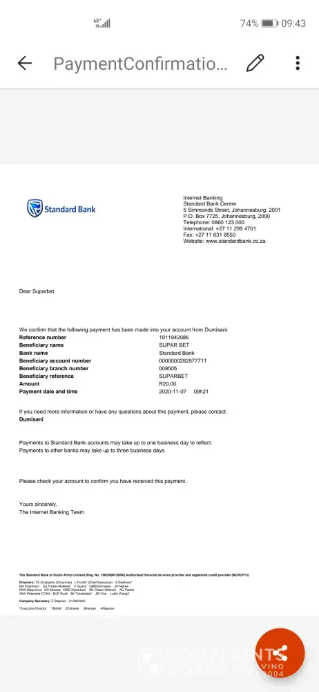 As you can see attached you transferred R9, 000 to my STD bank account yesterday Tuesday at 17H16. Until now the R9, 000 is not reflecting in my account. 1 minute later (17h17) you transferred R500 to an ABSA bank account (Account Number [protected]) that is not mine (see attached). I DID NOT send you an ABSA bank statement simply because I don't hold any bank account with ABSA. I hope that you did not also tansferred the R9, 000 I requested to another bank account.