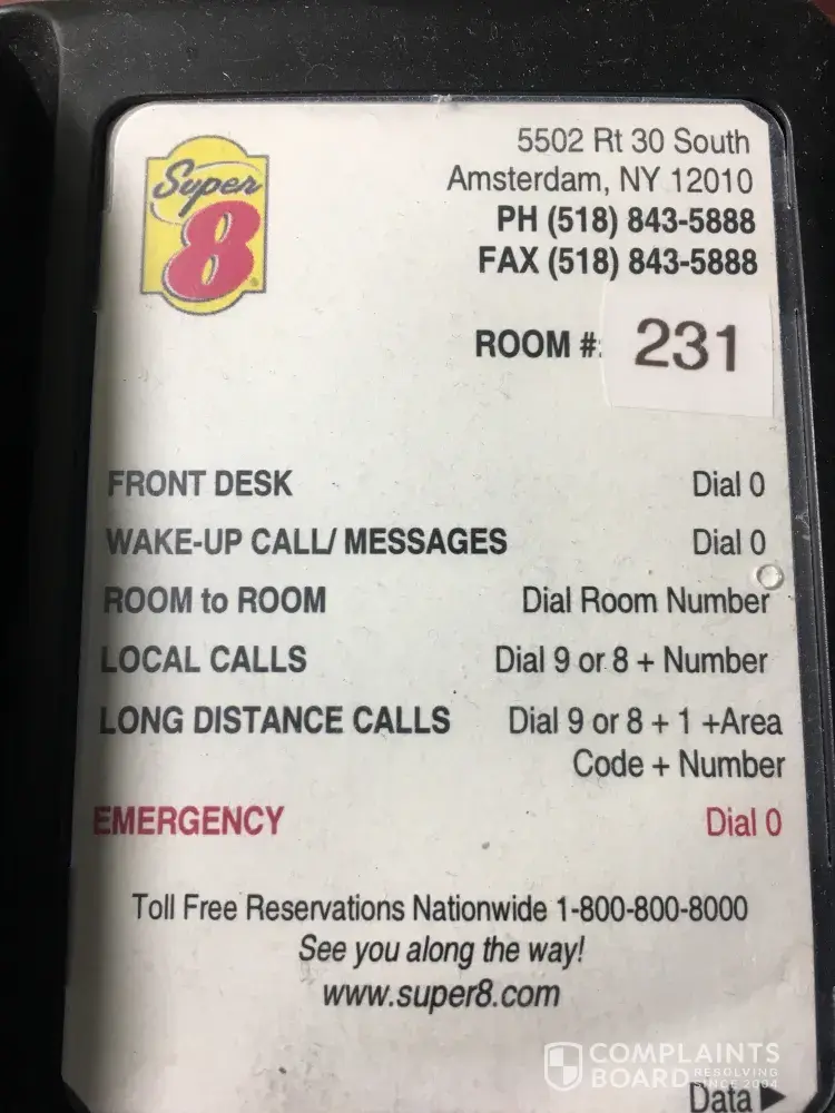 My son and I stayed at the Super 8 in Amsterdam, NY on Saturday, August 25. It was by far the worst hotel/motel experience in my 48 years. We paid $134, for a room that was unclean at best. There were men's underwear in the bathroom when we arrived. The surfaces of the room still had gunk on them, there were bugs in our room, tv, fridge, clock were unplugged, there was no remote for tv and there were still men's whiskers in the sink from shaving.