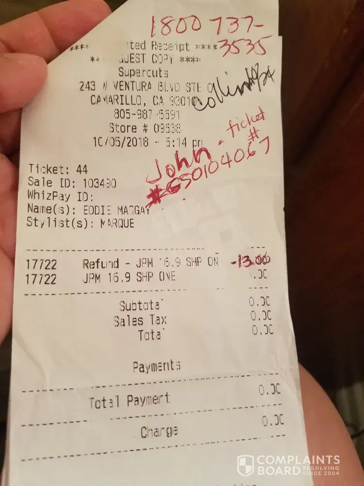 I initially bought a shampoo and paid $13. Marque said if my son will have a hair cut, the shampoo will be discounted..He said he will refund the $13, then he will charged me for the haircut and the shampoo with the discount. He gave me 2 receipts, 1 for the refund and another 1 for the shampoo and haircut. Up until now, i havent received the refund., i called the customer service 2x, spoke with John and Collin, still no good response.