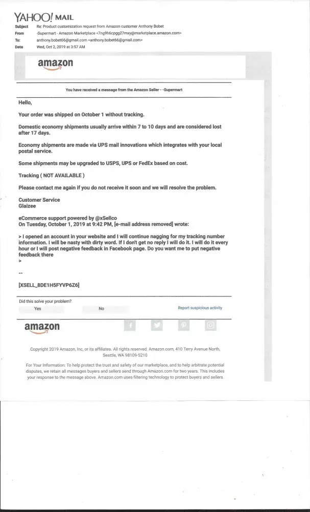 I PURCHASED AN ITEM FROM THEIR WEBSITE AND HAVE BEEN GETTING THE RUN AROUND FOR A WEEK. FINALLY I LOOKED THEM UP ON THE BETTER BUSINESS BUREAU AFTER CALLING THEIR NUMBER TODAY AND IT FORWARDED TO A MAN'S PERSONAL CELL PHONE WHO STATED HE WAS NOT AFFILIATED WITH AMAZON NOR SUPERMART. THE ADDRESS PROVIDED IS A 3 BEDROOM HOUSE. Now I have to go and dispute my payment and report them, etc. WHAT A SCAM. BEWARE!