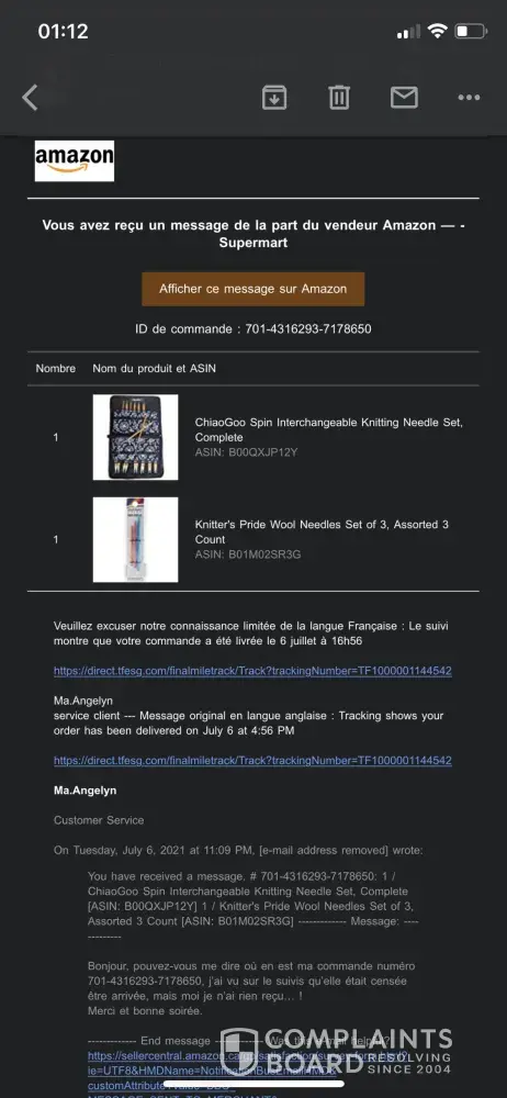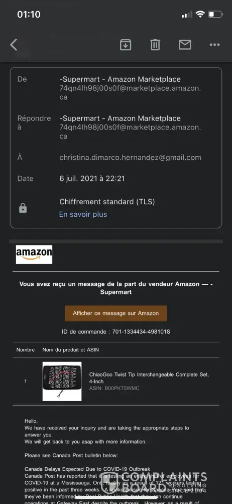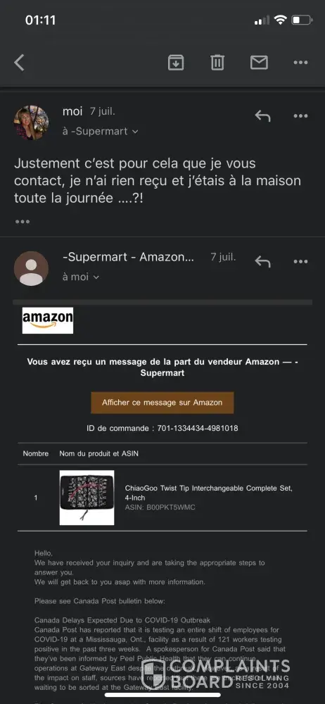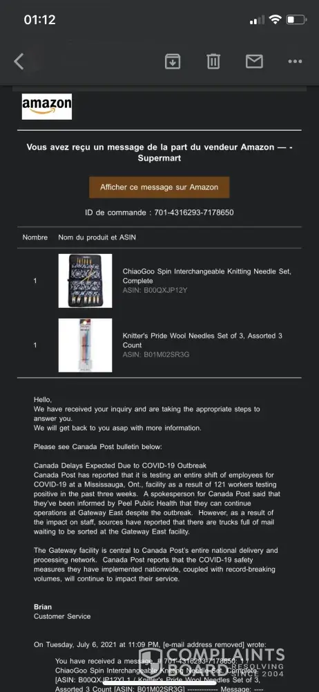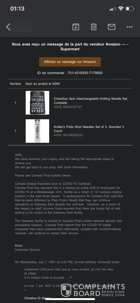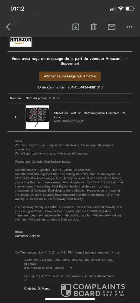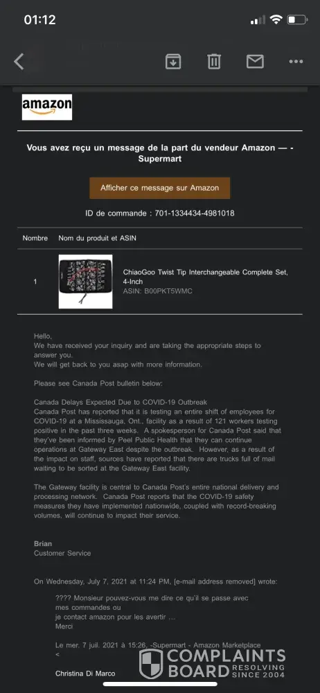 J'ai tenté de contacter votre service à la clientèle via Amazon et je tombe sur un monsieur "Brian" qui ne fait que m'envoyer les mêmes messages de confirmation "réception de votre demande" en boucle et ne m'aide pas, j'ai l'impression qu'il se moque de moi.