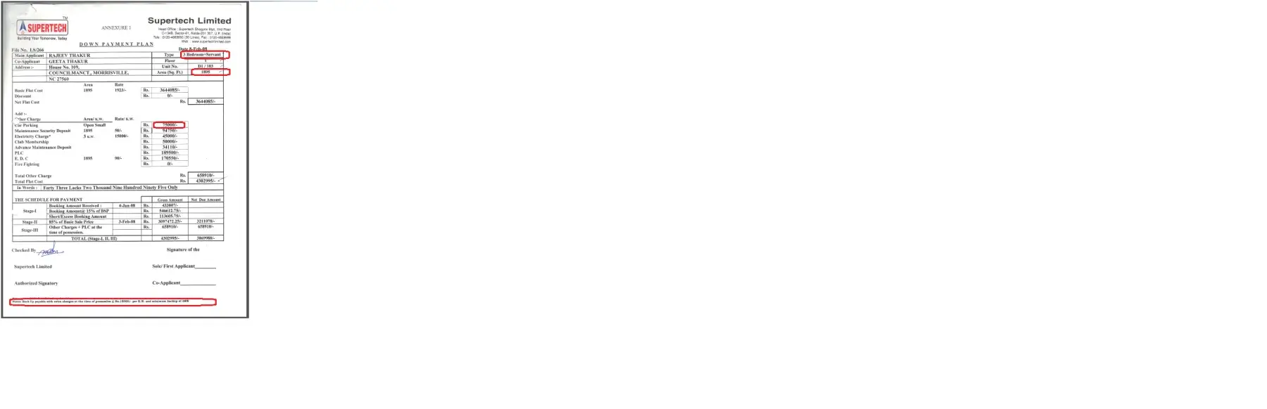 I request all the people to kindly go through the agreement as many extra clause is being added which will screw the customer like anything.There is already lots of complaints i have seen in this regard and this supertech is very much adament and even not bothered to answere the query also.