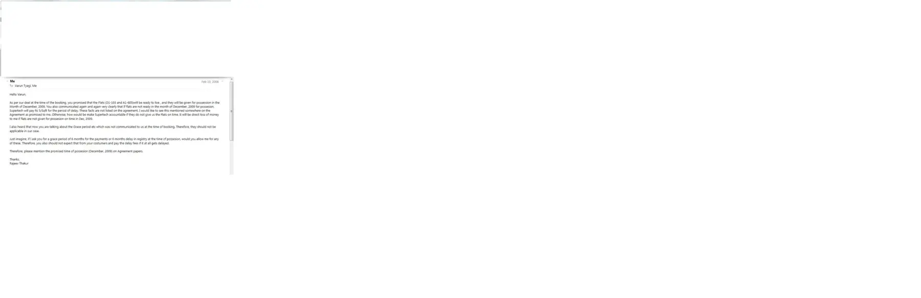3. Penalty (Rupees 5 per Square ft.) - As agreed and promised, the flat was supposed to be ready by December 2009, otherwise the Supertech Limited would pay Rupees 5 per Square ft. as the penalty. Company sends me a possession letter stating penalty will be adjusted as per agreement, rather than adjusting the penalty assuming I will forget about it. If Supertech sending me the final possession letter, don’t you think they would adjust the penalty there. This clearly shows there ill intentions of not adjusting the penalty and get away without paying penalty.