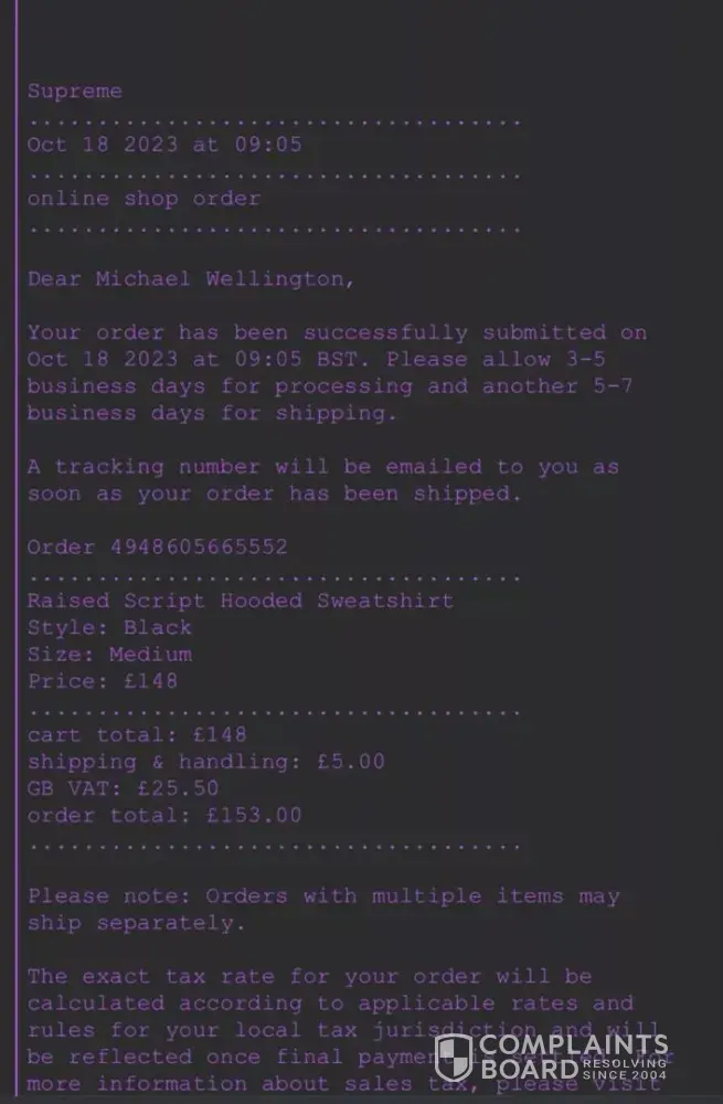 On Oct 2023 I purchased a black hoodie from Supreme.