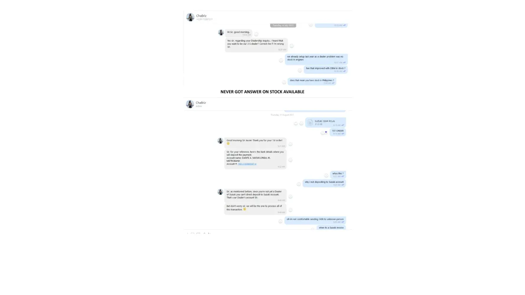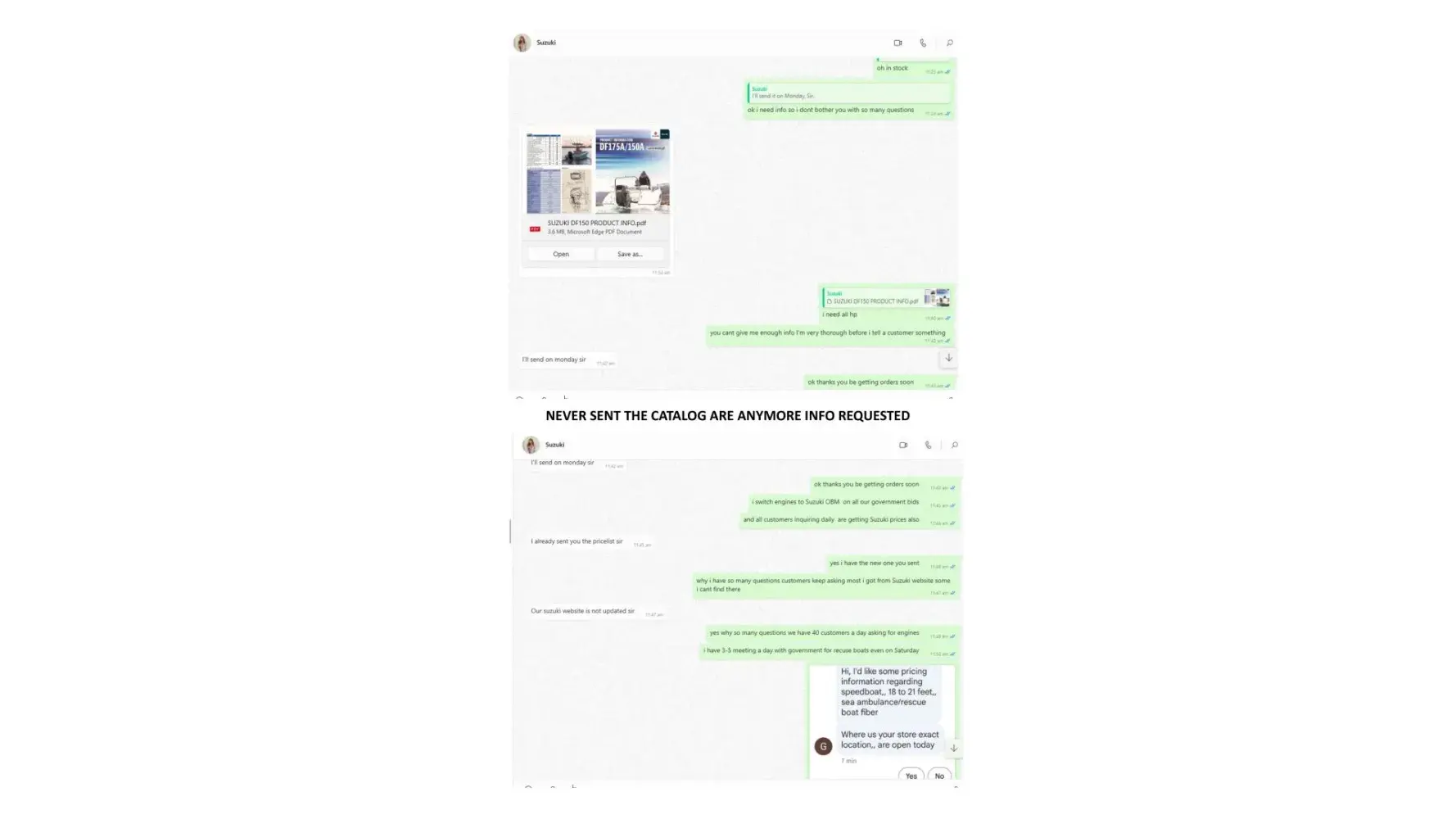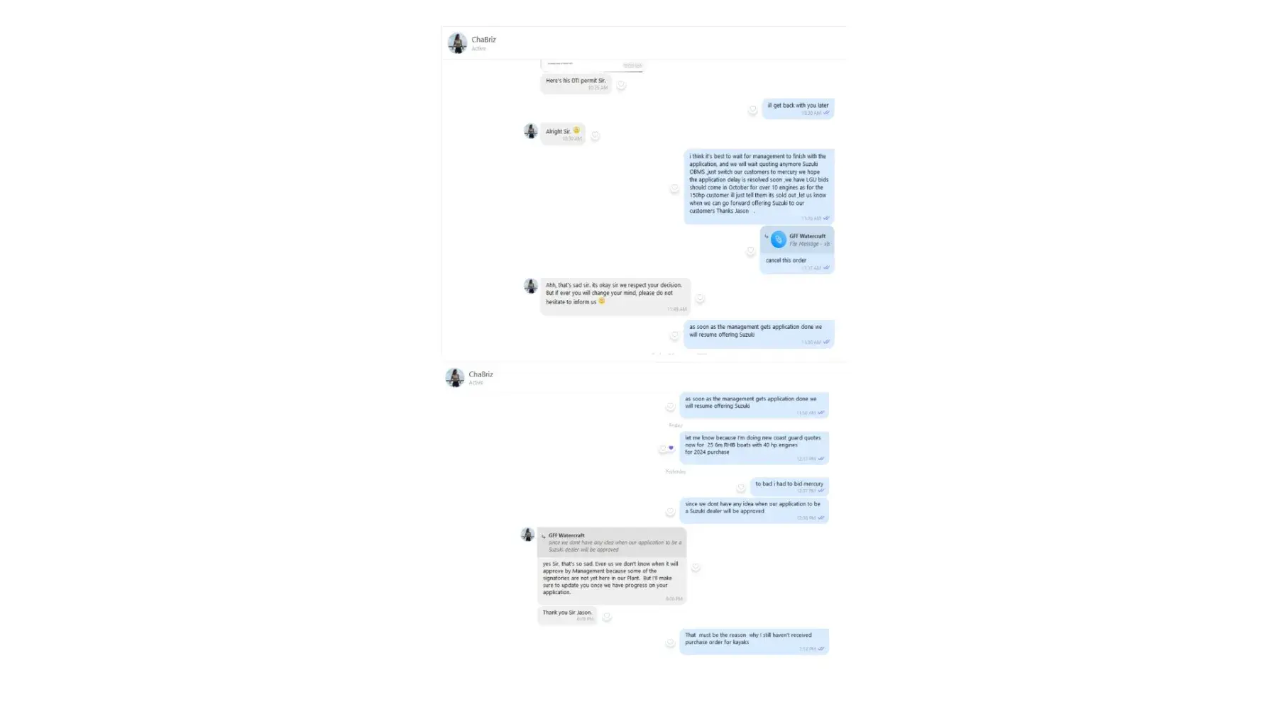 for months we have been waiting for our dealership application to be approved even after receiving dealer prices and promoting SUZUKI OBMS to our customers too find out its still waiting for someone to sign off "WHY SEND DEALER PRICES "and we could pay some unknown party for the engines until application is approved GFF is already a mercury dealer and sole distributor for the Philippines for Hidea and Aiqidi OBMS yet Suzuki Marine PH continues to mislead us with deception which has cause great Damage to GFF in lost sales