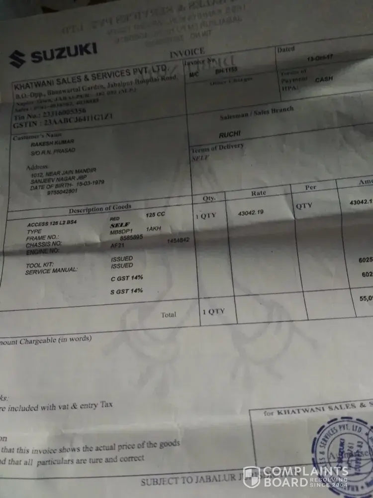 I have purchased suzuki access 125 from khatwani sales and service pvt ltd, jabalpur near to bhanwartal garden (Madhya pradesh) which is the authorised distributor of suzuki acess 125. I booked the scooter through paytm and got the delivery on 13.10.2017. Relevant documents for delivery of scooter is enclosed herewith.