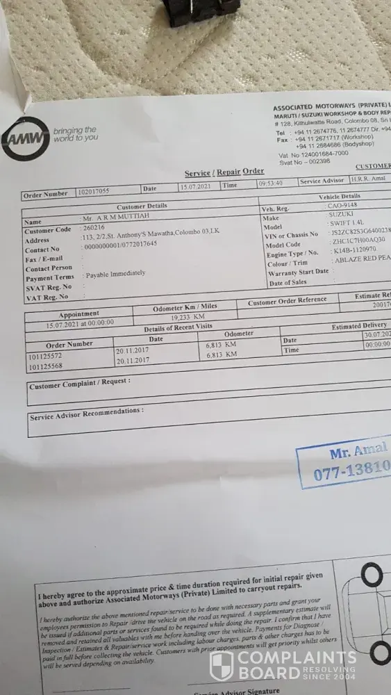 Suzuki swift repairs. Complaint on extremely poor service by the agent amw sri lanka