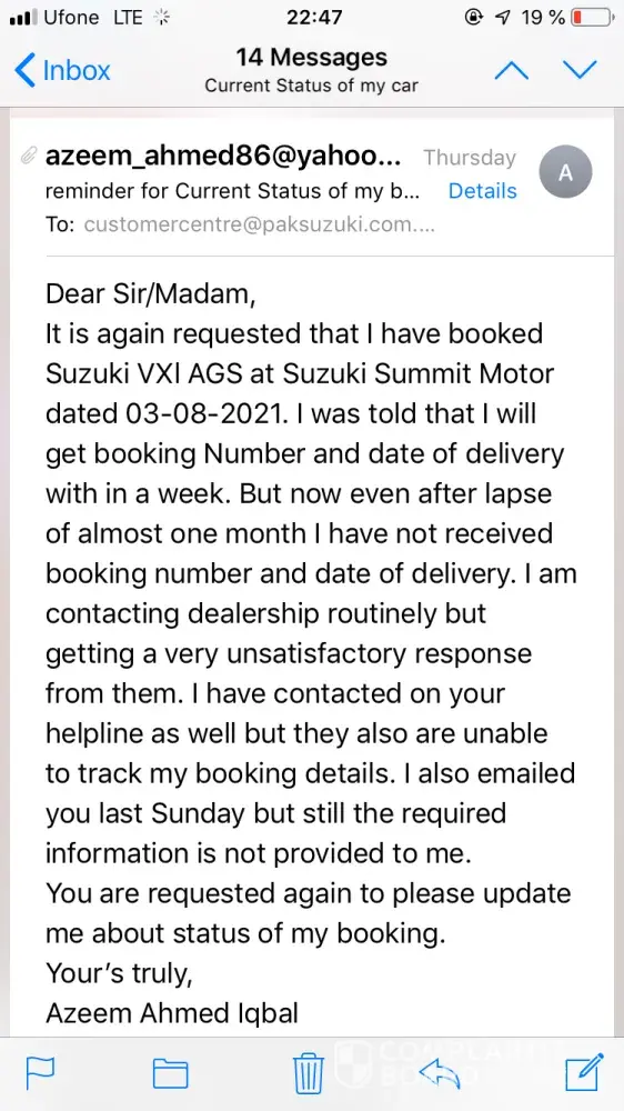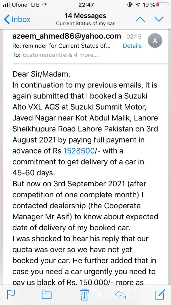 In continuation to my previous emails, it is again submitted that I booked a Suzuki Alto VXL AGS at Suzuki Summit Motor, Javed Nagar near Kot Abdul Malik, Lahore Sheikhupura Road Lahore Pakistan on 3rd August 2021 by paying full payment in advance of Rs 1528500/- with a commitment to get delivery of a car in 45-60 days.