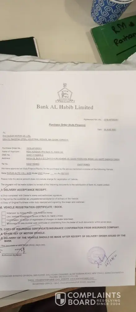All essential payments were directly removed from my BAHL account on August 20, 2021, and all receipts from the Suzuki company are attached herewith, but I have not been able to receive PBO form I've been calling your and your bank's representatives on a regular basis, but I have yet to receive a booking PBO number or showroom information. However, after calling Pak Suzuki, and the bank finally, received PBO after a month on 20 September 2021, the payment was received one month before and they issued me PBO form after one month even until today I don't know the delivery date. Kindly resolve my issue and deliver the car from the date of receiving the payment at Paksuzuki