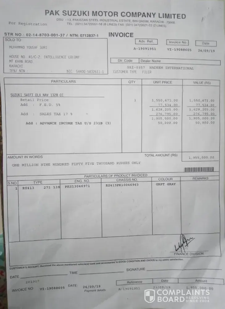 It is to inform you that the undersigned booked the Brand New Suzuki Swift DLX 2019 through the Pak Suzuki official booking office at Ocean Mall, Karachi via Pay order No. 4554835 of full amount Rs. 1, 955, 000 (Retail Price PKR 1, 905, 000 plus Advance Tax - Filer PKR 50, 000) on 16 September 2019.
